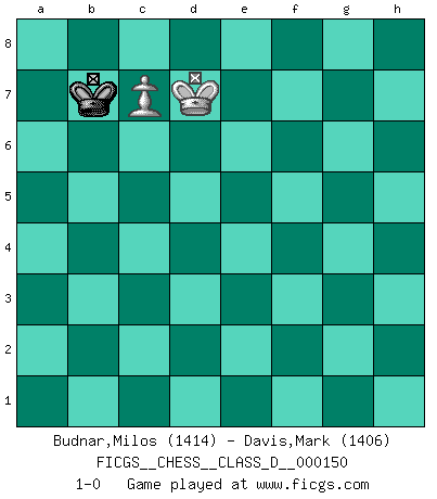 Last move : 1-0 2011 February 5 3:6:30 [Event "FICGS__CHESS__CLASS_D__000150"] [Site "FICGS"] [Date "2010.05.25"] [Round "1"] [White "Budnar,Milos"] [Black "Davis,Mark"] [Result "1-0"] [WhiteElo "1414"] [BlackElo "1406"] 1.e4 c5 2.Nf3 Nc6 3.g3 g6 4.Bg2 Bg7 5.Nc3 d6 6.O-O Nf6 7.Re1 O-O 8.d4 cxd4 9.Nxd4 Qb6 10.Nxc6 bxc6 11.e5 dxe5 12.Be3 Qc7 13.Bg5 Nd7 14.Bxe7 Re8 15.Bd6 Qb6 16.Ba3 Rd8 17.Qf3 Bb7 18.Ne4 c5 19.Qe3 Bxe4 20.Bxe4 Rac8 21.Rad1 Qb8 22.b3 Qb6 23.c4 Nf6 24.Rxd8 Rxd8 25.Qxc5 Nxe4 26.Rxe4 Qxc5 27.Bxc5 a6 28.a4 f5 29.Re3 e4 30.f3 Rd2 31.fxe4 Kf7 32.exf5 gxf5 33.Rf3 Kg6 34.h4 Be5 35.Bf2 h5 36.c5 Rc2 37.Rd3 f4 38.gxf4 Bxf4 39.Kg2 Kf5 40.Kf3 Bc7 41.b4 Rc4 42.Rd4 Rc3+ 43.Be3 Rb3 44.b5 axb5 45.axb5 Rxb5 46.Rd5+ Ke6 47.Rxh5 Kf6 48.Bf4 Bxf4 49.Kxf4 Rb4+ 50.Ke3 Kg6 51.Rg5+ Kf6 52.Rd5 Rxh4 53.Kd3 Ke6 54.Rd4 Rxd4+ 55.Kxd4 Kd7 56.Kd5 Kc7 57.c6 Kd8 58.Kd6 Kc8 59.c7 Kb7 60.Kd7 1-0 Sicilian defense Kingside Castling by player White (move 6) Kingside Castling by player Black (move 7) 10 pieces endgame at move 45 : White KRBPPP , Black KRBP WHITE : King + 1 Rook 1 Bishop 3 Pawns BLACK : King + 1 Rook 1 Bishop 1 Pawn 9 pieces endgame at move 45 : White KRBPP , Black KRBP WHITE : King + 1 Rook 1 Bishop 2 Pawns BLACK : King + 1 Rook 1 Bishop 1 Pawn 8 pieces endgame at move 47 : White KRBPP , Black KRB WHITE : King + 1 Rook 1 Bishop 2 Pawns BLACK : King + 1 Rook 1 Bishop 7 pieces endgame at move 48 : White KRPP , Black KRB WHITE : King + 1 Rook 2 Pawns BLACK : King + 1 Rook 1 Bishop 6 pieces endgame at move 49 : White KRPP , Black KR WHITE : King + 1 Rook 2 Pawns BLACK : King + 1 Rook 5 pieces endgame at move 52 : White KRP , Black KR WHITE : King + 1 Rook 1 Pawn BLACK : King + 1 Rook 4 pieces endgame at move 54 : White KP , Black KR WHITE : King + 1 Pawn BLACK : King + 1 Rook 3 pieces endgame at move 55 : White KP , Black K WHITE : King + 1 Pawn BLACK : King + Player White won this chess game. Follow this game move after move (download)Chess mastery essentially consists of analyzing Chess positions accurately. (Mikhail Botvinnik) Ich habe die besten Aussichten, den ersten Preis zu gewinnen - denn jeder muss gegen Steinitz spielen, nur ich nicht! (Wilhelm Steinitz) Haz el enroque temprano y seguido. (Rob Sillars) Pour se monter efficace, un Cavalier a besoin d'avant-postes ! Les Cavaliers font les meilleurs bloqueurs de pions passés. It's unlucky to be superstitious. (Dave Enteles)
