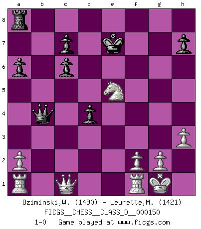 Last move : 1-0 2010 October 7 16:28:30 [Event "FICGS__CHESS__CLASS_D__000150"] [Site "FICGS"] [Date "2010.05.25"] [Round "1"] [White "Oziminski,Wojciech"] [Black "Leurette,Marc-Antoine"] [Result "1-0"] [WhiteElo "1490"] [BlackElo "1421"] 1.e4 e5 2.Nf3 Nc6 3.d4 exd4 4.Bc4 Nf6 5.e5 d5 6.Bb5 Bb4+ 7.c3 dxc3 8.bxc3 O-O 9.cxb4 Re8 10.O-O Ng4 11.Bg5 f6 12.exf6 gxf6 13.Bh4 a6 14.Bxc6 bxc6 15.h3 Ne5 16.Nc3 Qd6 17.Nxe5 Rxe5 18.Bg3 d4 19.Bxe5 fxe5 20.Ne4 Qxb4 21.Qc1 Bd7 22.Nf6+ Kf7 23.Nxd7 Ke7 24.Nxe5 1-0 Scotch gambit : Dubois-Reti defense Kingside Castling by player Black (move 8) Kingside Castling by player White (move 10) Player White won this chess game. Follow this game move after move (download)Chess is in its essence a game, in its form an art, and in its execution a science. (Baron Tassilo) Schach wird sich dank seiner hohen kulturellen Tradition immer durchsetzen. In näherer Zukunft womöglich sogar als Gegenreaktion auf die maßlose Reizüberflutung im Freizeit- und Spielbereich. (Garry Kasparov) El Ajedrez es como la guerra en un tablero. (Bobby Fischer) Vouloir jouer aux échecs contre soi-même est aussi paradoxal que vouloir marcher sur son ombre. (Stefan Zweig) Just because you do not take an interest in politics doesn't mean politics won't take an interest in you. (Pericles 430 B.C.)