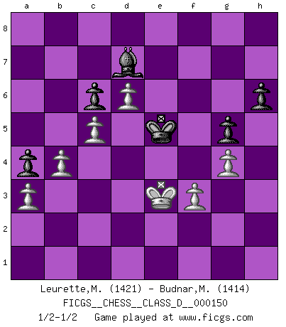 Last move : 1/2-1/2 2010 August 4 19:2:36 [Event "FICGS__CHESS__CLASS_D__000150"] [Site "FICGS"] [Date "2010.05.25"] [Round "1"] [White "Leurette,Marc-Antoine"] [Black "Budnar,Milos"] [Result "1/2-1/2"] [WhiteElo "1421"] [BlackElo "1414"] 1.e4 e5 2.Nf3 Nc6 3.Bc4 Nf6 4.Ng5 d5 5.exd5 Na5 6.d3 h6 7.Nf3 e4 8.Nc3 exf3 9.Qxf3 Nxc4 10.dxc4 Bb4 11.Bd2 Qe7+ 12.Qe2 Qxe2 13.Nxe2 Bxd2 14.Kxd2 O-O 15.Rae1 Re8 16.Nc3 Bd7 17.h3 Rxe1 18.Rxe1 Re8 19.g4 Rxe1 20.Kxe1 a6 21.f3 c6 22.d6 b5 23.c5 Nd5 24.Kd2 Nxc3 25.Kxc3 a5 26.a3 f5 27.b4 a4 28.Kd4 fxg4 29.hxg4 g5 30.c4 bxc4 31.Kxc4 Be6+ 32.Kd4 Kf7 33.Ke5 Bd7 34.Kd4 Ke6 35.Kc4 Ke5 36.Kd3 Kd5 37.Ke3 Ke5 1/2-1/2 Two knights defense : Kieseritsky variation Kingside Castling by player Black (move 14) This chess game ended in a draw. Follow this game move after move (download)No one ever won a game by resigning. (Unknown) Garry Kasparov war erst in der Großmeister-Organisation GMA, dann in der Profischach-Vereinigung PCA, zum Schluss kehrte er wieder in den Schoß der FIDE zurück. Aber gut, manche Leute sind flexibel (Viswanathan Anand) Te sientas frente a un tablero y repentinamente tu corazón brinca. Tu mano tiembla al tomar una pieza y moverla. Pero lo que el Ajedrez te enseña es que tu debes permanecer ahí con calma y pensar de que si realmente es una buena idea o de que si hay otras ideas mejores. (Stanley Kubrick) Ce n'est pas pour s'amuser qu'il joue aux échecs : il célèbre un culte. (Vladimir Nabokov) The Movers & Shakers of this world are those who play chess in the mornings and go to the disco in the evenings. (Dinesh De Silva)