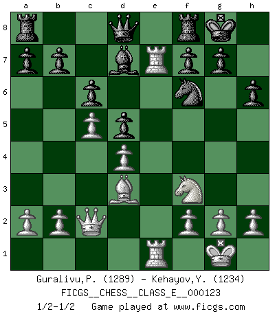 Last move : 1/2-1/2 2010 May 28 21:8:1 [Event "FICGS__CHESS__CLASS_E__000123"] [Site "FICGS"] [Date "2010.05.26"] [Round "1"] [White "Guralivu,Paul-Iosif"] [Black "Kehayov,Yulian"] [Result "1/2-1/2"] [WhiteElo "1289"] [BlackElo "1234"] 1.e4 d5 2.exd5 Qxd5 3.Nc3 Qd8 4.Nf3 e6 5.d4 Nf6 6.Bg5 Be7 7.Be2 h6 8.Bh4 Nd5 9.Bxe7 Qxe7 10.Nxd5 exd5 11.O-O O-O 12.c4 c6 13.Re1 Nd7 14.Bd3 Qd6 15.c5 Qc7 16.Re7 Qd8 17.Qe2 Nf6 18.Re1 Bd7 19.Qc2 1/2-1/2 Scandinavian (centre counter) defense Kingside Castling by player White (move 11) Kingside Castling by player Black (move 11) This chess game ended in a draw. Follow this game move after move (download)Chess is a foolish expedient for making idle people believe they are doing something very clever when they are only wasting their time. (George Bernard Shaw) Schach ist das schnellste Spiel der Welt, weil man in jeder Sekunde Tausende von Gedanken ordnen muß. (Albert Einstein) Muchos se han convertido en Maestros de Ajedrez, nadie se ha convertido en el Maestro del Ajedrez. (Siegbert Tarrasch) La vie et les Echecs sont tous les deux une lutte constante. (Lasker) The Internet isn't free. It just has an economy that makes no sense to capitalism. (Brad Shapcott)