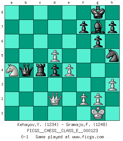 Last move : 0-1 2010 June 3 22:25:24 [Event "FICGS__CHESS__CLASS_E__000123"] [Site "FICGS"] [Date "2010.05.26"] [Round "1"] [White "Kehayov,Yulian"] [Black "Gramajo,Francisco"] [Result "0-1"] [WhiteElo "1234"] [BlackElo "1248"] 1.d4 g6 2.e4 Bg7 3.Nf3 d6 4.Bd3 Bg4 5.O-O e5 6.d5 Nf6 7.h3 Bxf3 8.Qxf3 Nbd7 9.c4 b6 10.Nc3 a6 11.b4 O-O 12.Be3 Rb8 13.a4 Qe7 14.a5 Rfc8 15.axb6 cxb6 16.Rxa6 Rb7 17.Na4 Nb8 18.Rxb6 Rxb6 19.Bxb6 Na6 20.Bd4 exd4 21.c5 Nxb4 22.cxd6 Qxd6 23.Rb1 Nxd3 24.Qxd3 Nh5 25.Qd2 Rc4 26.Rb4 Qxb4 0-1 Modern defense Kingside Castling by player White (move 5) Kingside Castling by player Black (move 11) Player Black won this chess game. Follow this game move after move (download)The King is a fighting piece. Use it ! (Wilhelm Steinitz) Schach ist die gewalttätigste aller Sportarten. (Garry Kasparov) La vida es como el Ajedrez, con lucha, competición y eventos buenos y malos. (Benjamin Franklin) Donnez-moi un Cavalier en 6e et je gagnerais toutes mes parties. (Steinitz) It is not titles that honor men, but men that honor titles. (Niccolo Machiavelli)