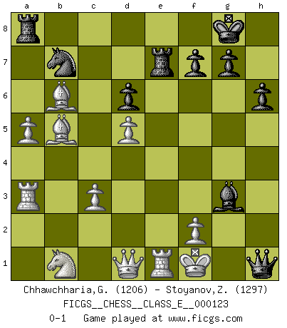Last move : 0-1 2010 September 5 21:0:29 [Event "FICGS__CHESS__CLASS_E__000123"] [Site "FICGS"] [Date "2010.05.26"] [Round "1"] [White "Chhawchharia,Gaurav"] [Black "Stoyanov,Zdravko"] [Result "0-1"] [WhiteElo "1206"] [BlackElo "1297"] 1.e4 c5 2.Nc3 Nc6 3.d3 e6 4.Be3 h6 5.Nf3 e5 6.Be2 d6 7.h3 Bd7 8.a3 Nf6 9.O-O Be7 10.Nd2 O-O 11.Bf3 a6 12.Nc4 b5 13.Nd2 Re8 14.Nd5 Nxd5 15.exd5 Na5 16.b4 cxb4 17.axb4 Nb7 18.d4 Qc8 19.Nb1 Qc4 20.c3 Bf6 21.Be2 Qc8 22.Ra3 a5 23.dxe5 Bxe5 24.bxa5 Bf5 25.Bxb5 Re7 26.Bb6 Bxh3 27.gxh3 Qxh3 28.Re1 Bh2+ 29.Kh1 Bg3 30.Kg1 Qh2+ 31.Kf1 Qh1+ 0-1 Sicilian : Closed, 2...Nc6 Kingside Castling by player White (move 9) Kingside Castling by player Black (move 10) Player Black won this chess game. Follow this game move after move (download)It is the aim of the modern school, not to treat every position according to one general law, but according to the principle inherent in the position. (Richard Reti) Ich rechne überhaupt nicht voraus. Ich gewinne auch so. (Robert James Fischer) Las ideas audaces son como las piezas del Ajedrez que avanzan hacia adelante. Ellas pueden ser vencidas, pero también pueden iniciar una partida victoriosa. (Goethe) L'ordinateur a tué l'originalité. Il n'y a plus guère d'aventures sur l'échiquier. (Jacob Murray) There is no instance of a country having benefited from prolonged warfare. (Sun Tzu)