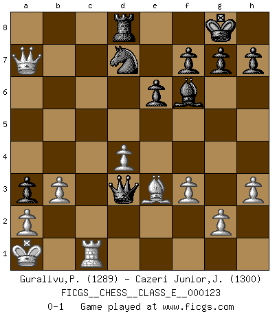 Last move : 0-1 2010 June 11 22:53:13 [Event "FICGS__CHESS__CLASS_E__000123"] [Site "FICGS"] [Date "2010.05.26"] [Round "1"] [White "Guralivu,Paul-Iosif"] [Black "Cazeri Junior,Jose Roque"] [Result "0-1"] [WhiteElo "1289"] [BlackElo "1300"] 1.e4 d5 2.exd5 Qxd5 3.Nc3 Qd6 4.Nf3 Nf6 5.d4 c6 6.Be2 Bg4 7.Be3 e6 8.h3 Bxf3 9.Bxf3 Be7 10.Qd2 Nbd7 11.O-O-O Nd5 12.Nxd5 cxd5 13.Kb1 O-O 14.c3 a5 15.Qd3 Rfc8 16.Be2 a4 17.Qb5 a3 18.b3 Rxc3 19.Rc1 Qc7 20.Bd2 Rc6 21.Rxc6 bxc6 22.Rc1 c5 23.Be3 c4 24.Bxc4 dxc4 25.Qxc4 Qa5 26.Qc7 Qf5+ 27.Ka1 Rd8 28.f3 Bf6 29.Qa7 Qd3 0-1 Scandinavian : Pytel-Wade variation Queenside Castling by player White (move 11) Kingside Castling by player Black (move 13) Player Black won this chess game. Follow this game move after move (download)When your house is on fire, you can't be bothered with the neighbors. Or, as we say in Chess, if your King is under attack you don't worry about losing a Pawn on the Queen's side. (Gary Kasparov) Kritik überlasse ich den Spießern. Ich zeige nichts, wofür ich mich schämen muss. (Alexandra Kosteniuk) El Peón aislado arroja penumbra sobre todo el tablero. (Aaron Nimzovich) En blitz, le Cavalier l'emporte sur le Fou. (Vlastimil Hort) If only people were all showed a certain minimum level of niceness; if only people didn't retract verbal draw offers (without draw box ticked) on ficgs; if only people didn't kill; if only people didn't run concentration / extermination camps, if only people didn't drop nuclear bombs on Hiroshima and Nagasaki, and so on - it would be a much more beautiful world. But sadly, things are not so... (Normajean Yates)