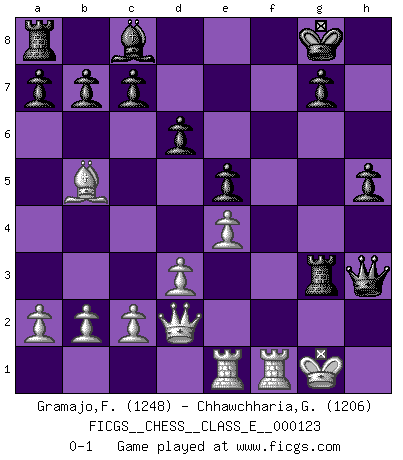 Last move : 0-1 2010 June 18 23:34:0 [Event "FICGS__CHESS__CLASS_E__000123"] [Site "FICGS"] [Date "2010.05.26"] [Round "1"] [White "Gramajo,Francisco"] [Black "Chhawchharia,Gaurav"] [Result "0-1"] [WhiteElo "1248"] [BlackElo "1206"] 1.e4 e5 2.Nf3 Nc6 3.Bb5 Nf6 4.O-O Bd6 5.d3 Ne7 6.Bg5 Nh5 7.Nbd2 h6 8.Bh4 O-O 9.g4 Nf4 10.Bg3 Neg6 11.h4 h5 12.g5 f6 13.Nc4 Be7 14.Ne3 fxg5 15.Nf5 Nh3+ 16.Kg2 g4 17.Nxe7+ Qxe7 18.Ng1 Nxh4+ 19.Bxh4 Qxh4 20.Nxh3 Qxh3+ 21.Kg1 d6 22.Qd2 Rf3 23.Rae1 g3 24.fxg3 Rxg3+ 0-1 Ruy Lopez : Berlin defense, 4.O-O Kingside Castling by player White (move 4) Kingside Castling by player Black (move 8) Player Black won this chess game. Follow this game move after move (download)Pawn endings are to Chess what putting is to golf. (Cecil Purdy) Zeige mir drei Eröffnungsvarianten und ich beweise dir, dass zwei davon inkorrekt sind. (Emanuel Lasker) Debió haber existido una vez en que los hombres eran semidióses, de otra manera no hubiesen podido inventar el Ajedrez. (Gustav Schenk) Horreur, mais aussi harmonie suprême : qu'y avait-il en effet au monde en dehors des échecs ? Le brouillard, l'inconnu, le non-être... (Vladimir Nabokov) There is no vagueness without wind. (Chinese proverb)