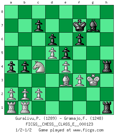 Last move : 1/2-1/2 2010 June 10 19:51:57 [Event "FICGS__CHESS__CLASS_E__000123"] [Site "FICGS"] [Date "2010.05.26"] [Round "1"] [White "Guralivu,Paul-Iosif"] [Black "Gramajo,Francisco"] [Result "1/2-1/2"] [WhiteElo "1289"] [BlackElo "1248"] 1.e4 e5 2.Nf3 Nc6 3.Bb5 Nge7 4.O-O a6 5.Ba4 d6 6.Nc3 b5 7.Bb3 Bd7 8.d4 Bg4 9.d5 Nd4 10.Bg5 h6 11.Bh4 g5 12.Bg3 h5 13.Qd2 Bxf3 14.Qxg5 Bh6 15.Qf6 Rh7 16.Kh1 Bg4 17.f3 Bd7 18.Bh4 Bg7 19.Qg5 f6 20.Qd2 b4 21.Nd1 a5 22.Ne3 Ng6 23.Bf2 Bb5 24.Rfb1 a4 25.Bc4 Bxc4 26.Nxc4 Nf4 27.Bxd4 h4 28.Be3 h3 29.Bxf4 hxg2+ 30.Qxg2 Qd7 31.Qg6+ Qf7 32.Qxf7+ Kxf7 33.Be3 Rah8 34.h4 Rxh4+ 35.Kg1 Rh1+ 36.Kf2 R8h2+ 37.Kg3 Rh3+ 38.Kg4 Rh4+ 39.Kg3 1/2-1/2 Ruy Lopez : Cozio defense Kingside Castling by player White (move 4) This chess game ended in a draw. Follow this game move after move (download)I am still a victim of Chess. It has all the beauty of art and much more. It cannot be commercialized. Chess is much purer than art in its social position. (Marcel Duchamp) Wenn ich mich einlogge, glauben die Leute gewöhnlich nicht, dass ich es selbst bin und sie fangen an, mir dumme Fragen zu stellen. Und wenn sie es glauben, stellen sie wieder andere dumme Fragen. (Judith Polgar) En el tablero, la mentira e hipocresía no sobreviven mucho. (Emanuel Lasker) La victoire dans une partie d'Echecs appartient la plupart du temps à celui qui voit un peu plus loin que l'adversaire. (Lasker) There is a great deal of difference between an eager man who wants to read a book and a tired man who wants a book to read. (G.K. Chesterton)