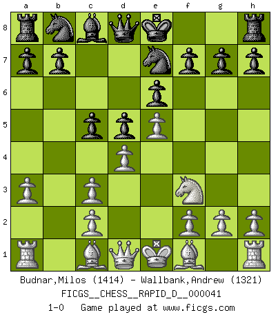 Last move : 1-0 2010 July 14 21:28:11 [Event "FICGS__CHESS__RAPID_D__000041"] [Site "FICGS"] [Date "2010.05.26"] [Round "1"] [White "Budnar,Milos"] [Black "Wallbank,Andrew"] [Result "1-0"] [WhiteElo "1414"] [BlackElo "1321"] 1.e4 e6 2.d4 d5 3.Nc3 Bb4 4.e5 c5 5.a3 Bxc3+ 6.bxc3 Ne7 7.Nf3 1-0 This chess game has been lost on time (started : 2010.05.26 5:49:45) French : Winawer, Advance, positional Main line Player White won this chess game. Follow this game move after move (download)The most powerful weapon in Chess is to have the next move. (David Bronstein) Schach ist ein Teil der Kultur, und wenn es mit der Kultur abwärts geht, geht es auch mit dem Schach abwärts. (Mikhail Moiseyevich Botvinik) Si el Ajedrez es una ciencia, es la mas inexacta. Si el Ajedrez es un arte, es demasiado inexacto para ser visto como tal. Si el Ajedrez es un deporte, es demasiado esotérico. Si el Ajedrez es un juego, es demasiado exigente para ser solo un juego. Si el Ajedrez es una aventura, es una muy demandante. Si el Ajedrez es una pasión, es una muy gratificante. Si el Ajedrez es la vida, es una muy triste. (Anónimo) Il s'avisa de me proposer d'apprendre les échecs qu'il jouait un peu... me voilà forcené des échecs. J'achète un échiquier, je m'enferme dans ma chambre, j'y passe des jours et des nuits à vouloir apprendre par cur toutes les parties. (Jean-Jacques Rousseau, Confessions) Always remember that you are unique; just like everyone else. (Unknown)