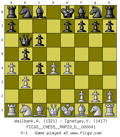 Last move : 0-1 2010 July 7 21:19:51 [Event "FICGS__CHESS__RAPID_D__000041"] [Site "FICGS"] [Date "2010.05.26"] [Round "1"] [White "Wallbank,Andrew"] [Black "Ignatyev,Vladimir"] [Result "0-1"] [WhiteElo "1321"] [BlackElo "1417"] 1.d4 d5 2.c4 dxc4 3.e4 b5 4.a4 c6 5.b3 Qb6 0-1 This chess game has been lost on time (started : 2010.05.26 5:49:45) QGA : 3.e4 Player Black won this chess game. Follow this game move after move (download)In Chess, at least, the brave inherit the earth. (Edmar Mednis) Glücklicherweise sind Großmeister Ruben Fines reine Schachbücher weniger phallozentrisch [als seine Schachpsychologie] und deswegen auch weniger lächerlich. (Nigel Short) ¿Que sería del Ajedrez sin errores graciosos?. (Kurt Richter) Donnez-moi un Cavalier en 6e et je gagnerais toutes mes parties. (Steinitz) A generalist learns less and less about more and more until he knows nothing about everything. (Author unknown)