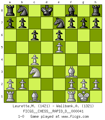 Last move : 1-0 2010 July 9 21:19:47 [Event "FICGS__CHESS__RAPID_D__000041"] [Site "FICGS"] [Date "2010.05.26"] [Round "1"] [White "Leurette,Marc-Antoine"] [Black "Wallbank,Andrew"] [Result "1-0"] [WhiteElo "1421"] [BlackElo "1321"] 1.e4 Nf6 2.e5 Nd5 3.d4 d6 4.Nf3 Bg4 5.Be2 c6 6.O-O Bxf3 7.Bxf3 dxe5 8.dxe5 e6 9.c4 Ne7 10.Qxd8+ Kxd8 11.Nc3 1-0 This chess game has been lost on time (started : 2010.05.26 5:49:45) Alekhine's defense : Modern, Flohr variation Kingside Castling by player White (move 6) Player White won this chess game. Follow this game move after move (download)Chess, like love, is infectious at any age. (Flohr) Den Ruhm habe ich schon, jetzt brauche ich noch das Geld. (Wilhelm Steinitz) El Ajedrez es realmente noventa y nueve por ciento calculación. (Soltis) Je fais ceci parce que dans cinquante coups j'obtiendrai cela; je m'appelle Mikhail Moisevitch Botvinnik. (Botvinnik) Whatever you do, don't be bored. This is absolutely the most exciting time we could have possibly hoped to be alive. And things are just starting. (From movie Waking life)