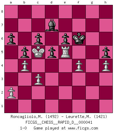 Last move : 1-0 2010 June 12 14:24:22 [Event "FICGS__CHESS__RAPID_D__000041"] [Site "FICGS"] [Date "2010.05.26"] [Round "1"] [White "Roncagliolo,Marco"] [Black "Leurette,Marc-Antoine"] [Result "1-0"] [WhiteElo "1492"] [BlackElo "1421"] 1.e4 e5 2.Nf3 Nc6 3.Bb5 Nf6 4.O-O Nxe4 5.d4 Nd6 6.Bxc6 dxc6 7.dxe5 Nf5 8.Qxd8+ Kxd8 9.Bg5+ Be7 10.Nc3 h6 11.Rad1+ Bd7 12.Bxe7+ Nxe7 13.e6 fxe6 14.Ne5 Nd5 15.Nf7+ Ke7 16.Nxh8 Rxh8 17.Nxd5+ cxd5 18.Rfe1 c6 19.f4 Rf8 20.g3 g6 21.Re5 b5 22.b4 a6 23.c3 Rf5 24.Rde1 Rxe5 25.Rxe5 Kf6 26.Kf2 g5 27.Ke3 gxf4+ 28.gxf4 Be8 29.Kd4 h5 30.h4 Bd7 31.Kc5 1-0 Ruy Lopez : Berlin defense, Open variation Kingside Castling by player White (move 4) Player White won this chess game. Follow this game move after move (download)When I asked Fischer why he had not played a certain move in our game, he replied: 'Well, you laughed when I wrote it down !' (Mikhail Tal) Ich war schon mal beim Dopingtest. Da musste ich Urin abgeben, während Dritte zusahen. (Elisabeth Pähtz) Fischer sacrificó virtualmente todo lo que la mayoría de nosotros los 'debiles' (término que él usa) valoramos, respetamos y apreciamos por el amor de un astuto, a menudo hermoso tablero de juego, por el privilegio ambivalente de ser su mas grande maestro. (Paul Kollar) Nous sommes les pions de la mystérieuse partie d'Echecs jouée par Dieu. Il nous déplace, nous arrête, nous pousse encore, puis nous lance un à un dans la boîte du Néant. Epitaphe sur la tombe de David Janowsky (1868-1927). Computers are like Old Testament gods; lots of rules and no mercy. (Joseph Campbell)