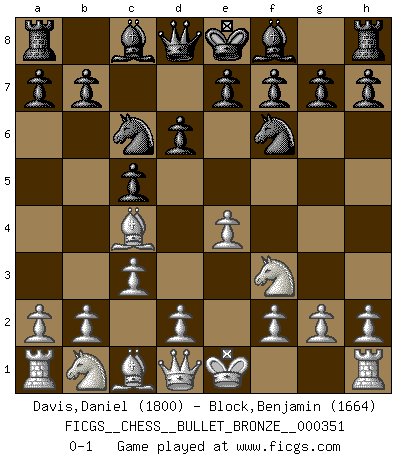 Last move : 0-1 2010 May 26 17:24:17 [Event "FICGS__CHESS__BULLET_BRONZE__000351"] [Site "FICGS"] [Date "2010.05.26"] [Round "1"] [White "Davis,Daniel"] [Black "Block,Benjamin"] [Result "0-1"] [WhiteElo "1800"] [BlackElo "1664"] 1.e4 c5 2.Bc4 Nc6 3.Nf3 d6 4.c3 Nf6 0-1 This chess game has been lost on time (started : 2010.05.26 16:52:3) Sicilian defense Player Black won this chess game. Follow this game move after move (download)The beauty of a move lies not in its' appearance but in the thought behind it. (Siegbert Tarrasch) Ich brauche nur einen Blick auf das Schachbrett zu werfen, und weiß schon, was in der Stellung steckt, was geschehen kann und was geschehen wird. Alle übrigen suchen und prüfen, ich aber weiß es! (José Raúl Capablanca) ¿Esta Bobby Fischer algo cuerdo?. (Salo Flohr) Les pièces de l'échiquier étaient impitoyables. Elles le retenaient, elles l'absorbaient. Il y avait de l'horreur en cela, mais aussi une harmonie unique. Car, qu'y a-t-il dans le monde, à part les échecs ? (V. Nabokov) The general who wins the battle makes many calculations in his temple before the battle is fought. The general who loses makes but few calculations beforehand. (Sun Tzu)