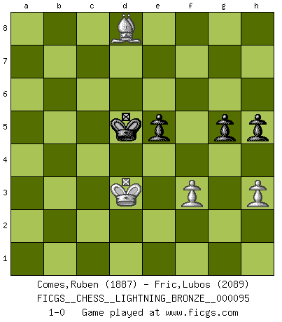 Last move : 1-0 2010 May 27 8:58:5 [Event "FICGS__CHESS__LIGHTNING_BRONZE__000095"] [Site "FICGS"] [Date "2010.05.27"] [Round "1"] [White "Comes,Ruben"] [Black "Fric,Lubos"] [Result "1-0"] [WhiteElo "1887"] [BlackElo "2089"] 1.e4 c5 2.Nf3 d6 3.d4 cxd4 4.Nxd4 Nf6 5.Nc3 a6 6.h3 e6 7.a4 Nc6 8.Be2 Be7 9.O-O O-O 10.Nxc6 bxc6 11.Bd3 d5 12.Bf4 Nd7 13.a5 d4 14.Ne2 e5 15.Bg3 Bf6 16.Nc1 Nc5 17.b4 Nxd3 18.Nxd3 Re8 19.f3 Ra7 20.c3 dxc3 21.Qc2 Rd7 22.Rfd1 Re6 23.Bf2 Bg5 24.Bb6 Qf6 25.Qxc3 Re8 26.Kf1 Bh4 27.Nb2 h6 28.Rxd7 Bxd7 29.Qd3 Bc8 30.Nc4 Be6 31.Nd6 Ra8 32.Rc1 Qf4 33.Rxc6 Qg3 34.Qe2 Bd7 35.Rc4 Qh2 36.Bg1 Qh1 37.Rc7 Bxh3 38.gxh3 Rd8 39.Rc6 Be7 40.Qg2 Qxg2+ 41.Kxg2 Rxd6 42.Rxd6 Bxd6 43.b5 axb5 44.Kf2 Bb8 45.Ke2 f5 46.Kd3 Kf7 47.exf5 Kf6 48.Kc3 Kxf5 49.Kb4 Ke6 50.a6 Kd6 51.Kxb5 Kc7 52.Bb6+ Kd6 53.Bc5+ Kc7 54.Kc4 Kc6 55.a7 Bxa7 56.Bxa7 Kd6 57.Kd3 Kd5 58.Bb8 g5 59.Bc7 h5 60.Bd8 1-0 Sicilian : Najdorf, Adams attack Kingside Castling by player White (move 9) Kingside Castling by player Black (move 9) 10 pieces endgame at move 51 : White KBPPP , Black KBPPP WHITE : King + 1 Bishop 3 Pawns BLACK : King + 1 Bishop 3 Pawns 9 pieces endgame at move 55 : White KBPP , Black KBPPP WHITE : King + 1 Bishop 2 Pawns BLACK : King + 1 Bishop 3 Pawns 8 pieces endgame at move 56 : White KBPP , Black KPPP WHITE : King + 1 Bishop 2 Pawns BLACK : King + 3 Pawns Player White won this chess game. Follow this game move after move (download)In a gambit you give up a Pawn for the sake of getting a lost game. (Samuel Standige Boden) Kritik überlasse ich den Spießern. Ich zeige nichts, wofür ich mich schämen muss. (Alexandra Kosteniuk) El Ajedrez es una manera fabulosa para que los niños aprendan a autovalorarse y a autoestimarse. (Saudin Robovic) Les échecs c'est le défi de l'alpiniste, toujours plus haut, prêt à tout pour monter à l'assaut du Roi ennemi. Les échecs, c'est de la musique en mouvement, un ballet majestueux pour les yeux. C'est de la poésie composée par les fantômes du passé qui au même titre que Rimbaud ou Verlaine méritent notre admiration. Les échecs, c'est de la peinture ou le moindre mouvement modifie le tableau pour en faire un Picasso ou un Van Gogh. Les échecs, c'est tout et rien, c'est la vie et la mort. Jjulie33 sur le forum de France-Echecs. Memory... is the diary that we all carry with us. (Oscar Wilde, The Importance of Being Earnest)