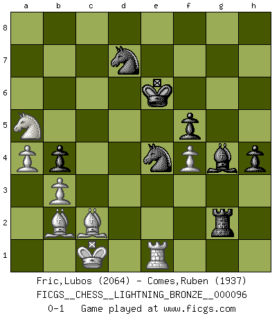 Last move : 0-1 2010 May 27 10:43:9 [Event "FICGS__CHESS__LIGHTNING_BRONZE__000096"] [Site "FICGS"] [Date "2010.05.27"] [Round "1"] [White "Fric,Lubos"] [Black "Comes,Ruben"] [Result "0-1"] [WhiteElo "2064"] [BlackElo "1937"] 1.d4 Nf6 2.c4 c6 3.Nf3 d5 4.e3 e6 5.Bd3 dxc4 6.Bxc4 c5 7.O-O a6 8.dxc5 Bxc5 9.Qxd8+ Kxd8 10.Ne5 Ke7 11.Be2 Rd8 12.b3 Nbd7 13.Nc4 b6 14.Bb2 Bb7 15.Nc3 b5 16.Na5 Ra7 17.Rfd1 Ba8 18.a4 b4 19.Na2 Rc7 20.Rac1 Rb8 21.Bd4 e5 22.Bb2 g6 23.Nc4 Bd5 24.Kf1 Ke6 25.f3 e4 26.Kf2 Ne8 27.h3 f5 28.fxe4 Bxe4 29.Nd2 Bb7 30.g4 a5 31.gxf5+ gxf5 32.Nc4 Ra8 33.Rc2 Nef6 34.Nc1 Ne4+ 35.Kf1 Rg8 36.Bd3 Ng3+ 37.Kf2 Be7 38.Nxa5 Rxc2+ 39.Bxc2 Nh1+ 40.Kf1 Bg2+ 41.Ke2 Ng3+ 42.Ke1 Ne4 43.Nd3 Bd6 44.Ke2 Bxh3 45.Re1 Bg4+ 46.Kf1 h5 47.Nf4+ Bxf4 48.exf4 Bh3+ 49.Ke2 Rg2+ 50.Kd1 h4 51.Kc1 Bg4 0-1 This chess game has been lost on time (started : 2010.05.27 9:13:58) Queen's pawn game Kingside Castling by player White (move 7) Player Black won this chess game. Follow this game move after move (download)Capture of the adverse King is the ultimate but not the first object of the game. (William Steinitz) Jede Eröffnung ist gut genug um gespielt zu werden, wenn nur ihr Ruf schlecht genug ist. (Savielly Grigorievitsch Tartakower) En el Ajedrez, cuando menos, el valiente hereda la tierra. (Edmar Mednis) Il a essayé de se convaincre qu'il pourrait empêcher toutes les erreurs et ne jamais perdre. L'horreur ! Gary Kasparov au sujet de Robert Fischer. Tree pose grows confidence. It roots me to this world. (Terri Guillemets)