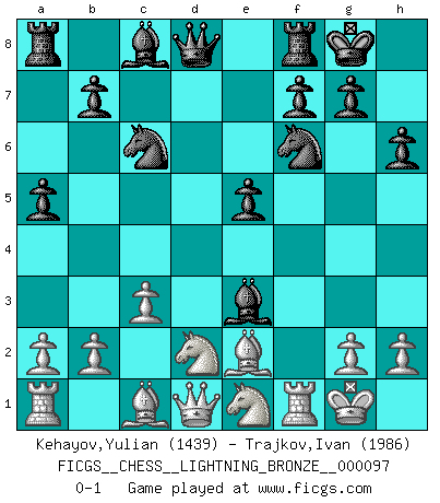 Last move : 0-1 2010 May 27 18:12:54 [Event "FICGS__CHESS__LIGHTNING_BRONZE__000097"] [Site "FICGS"] [Date "2010.05.27"] [Round "1"] [White "Kehayov,Yulian"] [Black "Trajkov,Ivan"] [Result "0-1"] [WhiteElo "1439"] [BlackElo "1986"] 1.d4 Nf6 2.Nc3 d5 3.e3 c5 4.dxc5 e6 5.Be2 Bxc5 6.Nf3 O-O 7.O-O Nc6 8.Nb1 e5 9.c3 h6 10.Nbd2 a5 11.e4 dxe4 12.Ne1 e3 13.fxe3 Bxe3+ 0-1 This chess game has been lost on time (started : 2010.05.27 17:25:48) Queen's pawn game Kingside Castling by player Black (move 6) Kingside Castling by player White (move 7) Player Black won this chess game. Follow this game move after move (download)The Chess pieces are the block alphabet which shapes thoughts; and these thoughts, although making a visual design on the chessboard, express their beauty abstractly, like a poem. (Marcel Duchamp) Aljechin war kein Nazi. Er war ein Opportunist. Ein schrecklicher Mann. Er liebte Geld über alles und würde für Geld ein Jude, ein Katolik oder ein Protestant werden. (Miguel Najdorf) No nos podemos resistir a la fascinación de un sacrificio ya que la pasión por los sacrificios es parte de la naturaleza de un jugador de Ajedrez. (Rudolf Spielman) Toutes les manuvres exécutées sur une colonne ouverte ont pour but ultime l'intrusion définitive sur la septième ou la huitième rangée, en plein cur de la position ennemie. (Aaron Nimzovitch) How many people work in NATO Headquarters ? - About half of them. (Dirk Stikker, NATO general secretary)