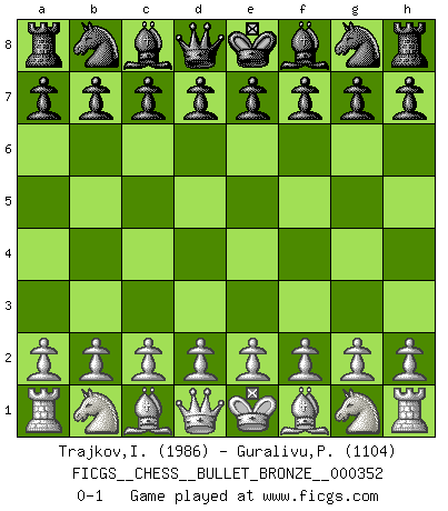 Last move : 0-1 2010 May 27 19:19:41 [Event "FICGS__CHESS__BULLET_BRONZE__000352"] [Site "FICGS"] [Date "2010.05.27"] [Round "1"] [White "Trajkov,Ivan"] [Black "Guralivu,Paul-Iosif"] [Result "0-1"] [WhiteElo "1986"] [BlackElo "1104"] 0-1 This chess game has been lost on time (started : 2010.05.27 19:11:7) Player Black won this chess game. Follow this game move after move (download)If cunning alone were needed to excel, women would be the best Chess players. (Albin) Ich hatte Angst gegen einen russischen Großmeister zu verlieren, und er befürchtete gegen einen kleinen Jungen zu verlieren. (über ein Remis gegen Juri Awerbach). (Robert James Fischer) El juego del Ajedrez no es solamente una diversión quieta; algunas cualidades muy valuables de la mente se pueden adquirir y cultivar con el, como convertirlos en habitos disponibles para toda ocasión; ya que la vida es algo así como el Ajedrez. (Benjamin Franklin) Le pion, dans sa simplicité, marche droit devant lui, mais lorsqu'il prend, il le fait obliquement? Ainsi l'homme, tant qu'il reste pauvre, marche dans la droiture et vit honnêtement, mais lorsqu'il recherche les honneurs, il flatte, se parjure et, par les voies obliques, cherche une position supérieure sur l'échiquier du monde. (Jean de Galles) Creativity is allowing yourself to make mistakes. Art is knowing which ones to keep. (Scott Adams)