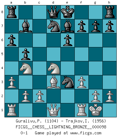Last move : 0-1 2010 May 27 19:36:23 [Event "FICGS__CHESS__LIGHTNING_BRONZE__000098"] [Site "FICGS"] [Date "2010.05.27"] [Round "1"] [White "Guralivu,Paul-Iosif"] [Black "Trajkov,Ivan"] [Result "0-1"] [WhiteElo "1104"] [BlackElo "1956"] 1.e4 c5 2.Nf3 d6 3.d4 cxd4 4.Nxd4 Nf6 5.Nc3 a6 6.Be3 e6 7.f3 b5 8.Bd3 Bb7 9.O-O Nbd7 10.a3 Be7 11.Na2 d5 12.exd5 Nxd5 13.Nb4 Nxe3 0-1 Sicilian : Najdorf, Byrne (English) attack Kingside Castling by player White (move 9) Player Black won this chess game. Follow this game move after move (download)The beauty of a move lies not in its' appearance but in the thought behind it. (Siegbert Tarrasch) Smyslow ist ein Beweis dafür, dass ich noch zehn Jahre spielen kann! [der 75 jährige über den 85 jährigen] (Viktor Kortschnoi) Fischer deseaba darle a los Rusos una sopa de su propia medicina. (Larry Evans) Les Echecs représentent une sphère d'idées créatrices basée sur la volonté des deux protagonistes. (Smyslov) Hold em is to stud what chess is to checkers. (Johnny Moss)