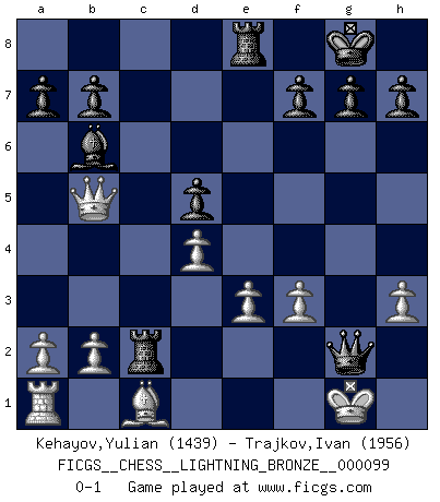 Last move : 0-1 2010 May 27 23:36:55 [Event "FICGS__CHESS__LIGHTNING_BRONZE__000099"] [Site "FICGS"] [Date "2010.05.27"] [Round "1"] [White "Kehayov,Yulian"] [Black "Trajkov,Ivan"] [Result "0-1"] [WhiteElo "1439"] [BlackElo "1956"] 1.d4 d5 2.Nc3 Nf6 3.Qd3 c5 4.dxc5 Nc6 5.Nf3 e5 6.e3 e4 7.Nxe4 Nxe4 8.Qd1 Bxc5 9.Bd3 O-O 10.O-O Bg4 11.h3 Bh5 12.Be2 Re8 13.c3 Qd6 14.Nd4 Bxe2 15.Qxe2 Nxd4 16.cxd4 Bb6 17.f3 Ng3 18.Qf2 Nxf1 19.Qxf1 Rac8 20.Qf2 Qg6 21.Qe2 Rc2 22.Qf1 Qg3 23.Qb5 Qxg2+ 0-1 Queen's pawn : Chigorin variation Kingside Castling by player Black (move 9) Kingside Castling by player White (move 10) Player Black won this chess game. Follow this game move after move (download)Your body has to be in top condition. Your Chess deteriorates as your body does. You can't separate body from mind. (Bobby Fischer) Es gibt keine einzige Frau, der ich nicht einen Springer vorgeben könnte und trotzdem gewänne. (Robert James Fischer) El juego de Damas es para vagabundos. (Paul Morphy) Toutes choses étant égales, c'est la conviction qui gagne. Alliée à une volonté de vaincre, elle sert de détonateur, suscite des idées, disperse les doutes et aide à penser clairement. (Robert Fischer) Patience, use the Force, think ! (Obi-Wan Kenobi in Star Wars ep.2)