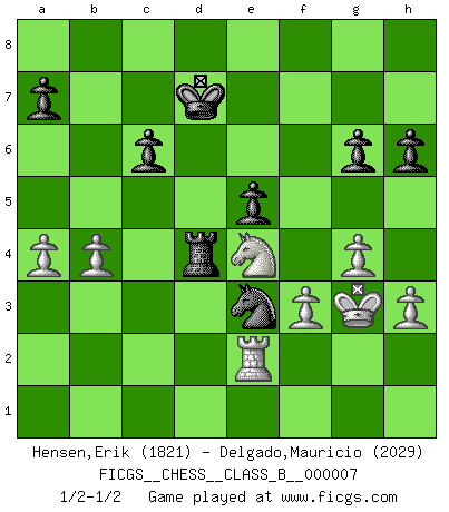 Last move : 1/2-1/2 2006 November 17 4:23:54 [Event "FICGS__CHESS__CLASS_B__000007"] [Site "FICGS"] [Date "2006.11.03"] [Round "1"] [White "Hensen,Erik"] [Black "Delgado,Mauricio"] [Result "1/2-1/2"] [WhiteElo "1821"] [BlackElo "2029"] 1.e4 e5 2.Nf3 Nf6 3.Nxe5 d6 4.Nf3 Nxe4 5.d4 d5 6.Bd3 Nc6 7.O-O Be7 8.c4 Nb4 9.Be2 dxc4 10.Bxc4 O-O 11.Nc3 Nd6 12.Bb3 Bf6 13.h3 Re8 14.Bf4 Bf5 15.Qd2 Rc8 16.Rfe1 Rxe1+ 17.Rxe1 Nd3 18.Re2 Nxf4 19.Qxf4 c6 20.Ne5 g6 21.g4 Be6 22.Bxe6 fxe6 23.Nd7 Qxd7 24.Qxf6 Re8 25.a4 Nc4 26.Ne4 Rf8 27.Nc5 Rxf6 28.Nxd7 Rf4 29.Nc5 Rxd4 30.Nxb7 Kf7 31.Kg2 Ke7 32.b3 Nd2 33.Nc5 e5 34.b4 Nc4 35.Kg3 h6 36.f3 Kd6 37.Ne4+ Kd7 38.Rc2 Ne3 39.Re2 Nc4 40.Rc2 Ne3 41.Re2 1/2-1/2 Petrov : Classical attack Kingside Castling by player White (move 7) Kingside Castling by player Black (move 10) This chess game ended in a draw. Follow this game move after move (download)The hardest game to win is a won game. (Emanuel Lasker) Ich organisiere ein großes Turnier, was mich etwa 120000 Dollar kostet. Ich denke, das ist das erste Mal in der Schachgeschichte, daß ein Schachgroßmeister auch als Mäzen auftritt. (Miguel Najdorf) ¡Examina movidas que hagan daño! Un buen ojo for movidas desvastantes es mucho mas importante que el conocimiento de principios estratégicos. (Purdy) Aux échecs, l'amour-propre est satisfait quand on remporte la victoire, mais il n'y a pas de honte à être battu. (Benjamin Franklin) Animated gif is worth one mega-word. (Unknown)