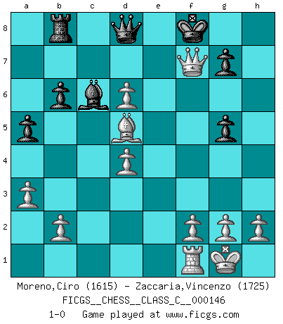 Last move : 1-0 2010 December 9 3:12:40 [Event "FICGS__CHESS__CLASS_C__000146"] [Site "FICGS"] [Date "2010.05.28"] [Round "1"] [White "Moreno,Ciro"] [Black "Zaccaria,Vincenzo"] [Result "1-0"] [WhiteElo "1615"] [BlackElo "1725"] 1.c4 e6 2.d4 Bb4+ 3.Bd2 Bxd2+ 4.Qxd2 Nf6 5.Nc3 O-O 6.e4 d5 7.e5 b6 8.exf6 Qxf6 9.cxd5 Re8 10.Bb5 Bd7 11.Be2 c6 12.d6 a5 13.Nf3 Qd8 14.Rc1 Na6 15.O-O Bc8 16.Qf4 Nb4 17.a3 Nd5 18.Nxd5 exd5 19.Bd3 Re6 20.Rxc6 Rb8 21.Bxh7+ Kf8 22.Bf5 Re4 23.Bxe4 Bd7 24.Ng5 f6 25.Qh4 fxg5 26.Qh8+ Kf7 27.Qh5+ Kf8 28.Bxd5 Bxc6 29.Qf7+ 1-0 English Opening Kingside Castling by player Black (move 5) Kingside Castling by player White (move 15) Player White won this chess game. Follow this game move after move (download)Man is a frivolous, a specious creature, and like a Chess player, cares more for the process of attaining his goal than for the goal itself. (Dostoyevsky) Kritik überlasse ich den Spießern. Ich zeige nichts, wofür ich mich schämen muss. (Alexandra Kosteniuk) Cuando tengas duda... ¡juega al Ajedrez!. (Tevis) Il vaut mieux sacrifier les pièces de l'adversaire. (Xavier Tartacover) Depression is just anger without enthusiasm. (Unknown)