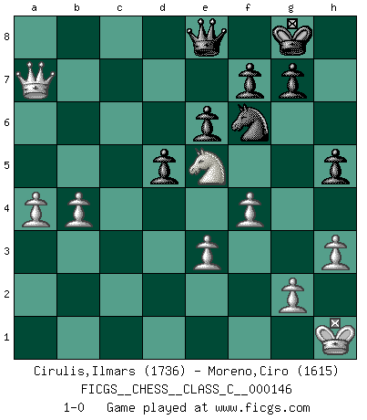 Last move : 1-0 2011 March 25 0:52:50 [Event "FICGS__CHESS__CLASS_C__000146"] [Site "FICGS"] [Date "2010.05.28"] [Round "1"] [White "Cirulis,Ilmars"] [Black "Moreno,Ciro"] [Result "1-0"] [WhiteElo "1736"] [BlackElo "1615"] 1.f4 Nf6 2.c4 e6 3.Nf3 d5 4.e3 Bd6 5.d4 c5 6.Be2 cxd4 7.Nxd4 dxc4 8.O-O O-O 9.Nd2 Bc5 10.N2f3 Qd6 11.Bxc4 Rd8 12.Qe2 Nc6 13.Nxc6 bxc6 14.Kh1 Rb8 15.b3 Qe7 16.Ne5 Rb6 17.Bd2 Bb4 18.Bxb4 Qxb4 19.Rfd1 Qe7 20.Rxd8+ Qxd8 21.Rd1 Qf8 22.Qd2 Ba6 23.Qa5 Bb5 24.Bxb5 Rxb5 25.Qxa7 Rd5 26.Rxd5 cxd5 27.b4 h5 28.h3 Qe8 29.a4 1-0 This chess game has been lost on time (started : 2010.05.28 8:46:23) Bird's Opening Kingside Castling by player White (move 8) Kingside Castling by player Black (move 8) Player White won this chess game. Follow this game move after move (download)Without error there can be no brilliancy. (Emanuel Lasker) Der Verteidiger gebe der Gewalt nach, aber nur der Gewalt. Er schaffe sich nicht freiwillig, etwa aus Blindheit oder aus Schrecken, irgendwelche Schwächen. Er lasse sich nicht bluffen. (Emanuel Lasker) Hasta este punto, las blancas han seguido un análisis bien conocido. Pero ahora el hace un error fatal: empieza a usar su propia cabeza. (Siegbert Tarrasch) Horreur, mais aussi harmonie suprême : qu'y avait-il en effet au monde en dehors des échecs ? Le brouillard, l'inconnu, le non-être... (Vladimir Nabokov) When the going gets tactical, the computers get going. (Hyatt)