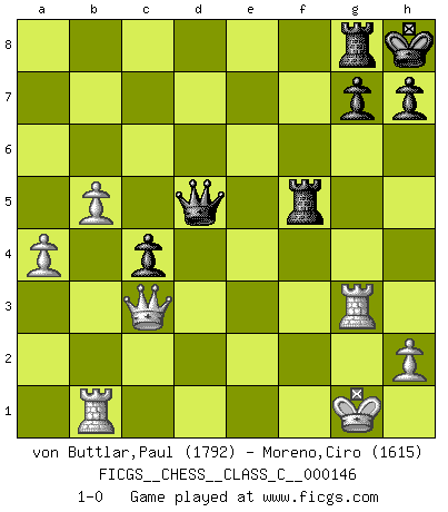 Last move : 1-0 2011 March 30 2:3:44 [Event "FICGS__CHESS__CLASS_C__000146"] [Site "FICGS"] [Date "2010.05.28"] [Round "1"] [White "von Buttlar,Paul"] [Black "Moreno,Ciro"] [Result "1-0"] [WhiteElo "1792"] [BlackElo "1615"] 1.c4 e5 2.Nc3 Nc6 3.Nf3 Nf6 4.d4 e4 5.Nd2 Nxd4 6.Ndxe4 Ne6 7.g3 Nxe4 8.Nxe4 Be7 9.Bg2 O-O 10.O-O f5 11.Nc3 f4 12.Nd5 Bg5 13.Bxf4 Bxf4 14.Nxf4 Nxf4 15.gxf4 Rxf4 16.e3 Rf6 17.f4 d6 18.b3 c6 19.Qd4 Qa5 20.Rf3 Bf5 21.Rg3 Raf8 22.a3 a6 23.b4 Qc7 24.e4 Be6 25.f5 c5 26.Qd3 Bf7 27.Qc3 Kh8 28.b5 axb5 29.cxb5 Qb6 30.a4 Rg8 31.Kh1 d5 32.exd5 Rxf5 33.d6 Qxd6 34.Bxb7 Bd5+ 35.Bxd5 Qxd5+ 36.Kg1 c4 37.Rb1 1-0 This chess game has been lost on time (started : 2010.05.28 8:46:23) English : Bradley Beach variation Kingside Castling by player Black (move 9) Kingside Castling by player White (move 10) Player White won this chess game. Follow this game move after move (download)The combination player thinks forward; he starts from the given position, and tries the forceful moves in his mind. (Emanuel Lasker) Ich las kürzlich ein Buch von Nietzsche. Er sagte Religion verdumme nur die Menschen. Ich stimme zu. (Robert James Fischer) Vive, pierde y aprende al observar a tu oponente como ganar. (Amber Steenbock) Tous ces prétendus hommes politiques sont les pions, les Cavaliers, les Tours ou les Fous d'une partie d'échecs qui se jouera tant qu'un hasard ne renversera pas l'échiquier. (Honoré de Balzac) Fortune favours the audacious. (Desiderius Erasmus)