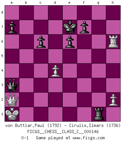 Last move : 0-1 2010 October 28 16:27:31 [Event "FICGS__CHESS__CLASS_C__000146"] [Site "FICGS"] [Date "2010.05.28"] [Round "1"] [White "von Buttlar,Paul"] [Black "Cirulis,Ilmars"] [Result "0-1"] [WhiteElo "1792"] [BlackElo "1736"] 1.c4 e6 2.Nc3 c6 3.e4 d5 4.d4 dxe4 5.f3 Nf6 6.Bg5 Bb4 7.Qd2 Nbd7 8.O-O-O h6 9.Be3 b5 10.Qc2 Qa5 11.fxe4 Bxc3 12.bxc3 bxc4 13.Bxc4 Nxe4 14.Ne2 Ndf6 15.Bb3 O-O 16.g4 Ba6 17.c4 Nd6 18.g5 hxg5 19.Rhg1 Bxc4 20.Bxg5 Qa3+ 21.Kb1 Rfb8 22.Nc1 Bxb3 23.axb3 Nd5 24.Bh6 Nf5 25.Rxg7+ Kf8 26.Rh7 Nxh6 27.Rxh6 Ne3 28.Qd3 Nxd1 29.Qxd1 Ke7 30.Qd2 Rxb3+ 31.Nxb3 Qxb3+ 32.Qb2 Qd3+ 33.Ka1 Rg8 34.Qf2 Qa3+ 35.Qa2 Rg1+ 0-1 English Opening Queenside Castling by player White (move 8) Kingside Castling by player Black (move 15) Player Black won this chess game. Follow this game move after move (download)Chess is everything: art, science and sport. (Anatoly Karpov) Ich war schon mal beim Dopingtest. Da musste ich Urin abgeben, während Dritte zusahen. (Elisabeth Pähtz) Con o sin el título, Bobby Fischer fue sin lugar a dudas el mas grande jugador de su época. (Burt Hochberg) A chaque perte on perd un peu de soi. (Joël Lautier) Man is still the most extraordinary computer of all. (John F. Kennedy)