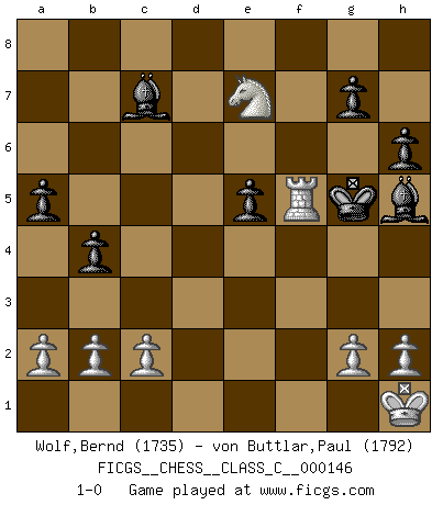 Last move : 1-0 2010 June 22 22:21:14 [Event "FICGS__CHESS__CLASS_C__000146"] [Site "FICGS"] [Date "2010.05.28"] [Round "1"] [White "Wolf,Bernd"] [Black "von Buttlar,Paul"] [Result "1-0"] [WhiteElo "1735"] [BlackElo "1792"] 1.e4 e6 2.d4 d5 3.Nc3 Nf6 4.e5 Nfd7 5.f4 c5 6.Nf3 Nc6 7.Be3 Be7 8.Be2 O-O 9.O-O a6 10.Qd2 b5 11.Nd1 cxd4 12.Nxd4 Nxd4 13.Bxd4 b4 14.Ne3 a5 15.f5 f6 16.fxe6 Nxe5 17.Bxe5 fxe5 18.Qxd5 Qxd5 19.Rxf8+ Bxf8 20.Nxd5 Bd6 21.e7 Be6 22.Bc4 Bf7 23.Rd1 Re8 24.Bb3 h6 25.Ba4 Bxe7 26.Bxe8 Bc5+ 27.Kh1 Bxe8 28.Re1 Bd6 29.Ne3 Kf7 30.Nf5 Bc7 31.Rf1 Kg6 32.Ne7+ Kg5 33.Rf8 Bh5 34.Rf5+ 1-0 French : Steinitz, Boleslavsky variation Kingside Castling by player Black (move 8) Kingside Castling by player White (move 9) Player White won this chess game. Follow this game move after move (download)Live, lose, and learn, by observing your opponent how to win. (Amber Steenbock) Ich würde die 30 stärksten Spieler der USA im Simultanspiel besiegen. (José Raúl Capablanca) En posiciones complicadas, Bobby Fischer pocas veces tuvo que temer de cualquiera. (Paul Keres) On a dit que l'homme se distingue de l'animal par le fait qu'il achète plus de livres qu'il ne peut en lire. Je voudrais suggérer qu'inclure à la liste des livres quelques livres d'échecs rendrait la distinction manifeste. (Edward Lasker) Follow your passion, and success will follow you. (Arthur Buddhold)