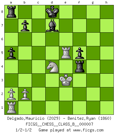 Last move : 1/2-1/2 2006 December 10 2:45:15 [Event "FICGS__CHESS__CLASS_B__000007"] [Site "FICGS"] [Date "2006.11.03"] [Round "1"] [White "Delgado,Mauricio"] [Black "Benitez,Ryan"] [Result "1/2-1/2"] [WhiteElo "2029"] [BlackElo "1860"] 1.d4 d5 2.Nf3 e6 3.Nbd2 c5 4.e4 Nf6 5.e5 Nfd7 6.c3 Nc6 7.Bd3 Be7 8.O-O a5 9.Re1 cxd4 10.cxd4 g5 11.h4 h6 12.hxg5 hxg5 13.g4 Qb6 14.Qa4 Nf8 15.Qb3 Qa7 16.Nf1 Nxd4 17.Qa4+ Nc6 18.Be3 Qb8 19.Bxg5 Bxg5 20.Nxg5 Rg8 21.Nf3 Bd7 22.Qf4 f5 23.Ne3 d4 24.Nxd4 Qxe5 25.Qxe5 Nxe5 26.Bxf5 exf5 27.Ng2 Nfg6 28.f4 Nxf4 29.Rxe5+ Kd8 30.Nxf4 Rxg4+ 31.Kf2 Rxf4+ 32.Ke3 1/2-1/2 Queen's pawn game Kingside Castling by player White (move 8) This chess game ended in a draw. Follow this game move after move (download)Fischer Chess play was always razor-sharp, rational and brilliant. One of the best ever. (Dave Regis) In der Schule lernt man nichts. Es ist nur Zeitverschwendung. (Robert James Fischer) Nos gusta pensar. (Gary Kasparov) Les échecs sont utiles à l'exercice de la faculté de penser et à celle de l'imagination. Car nous devons posséder une méthode élaborée pour atteindre des buts partout où nous devons conduire notre raison. (Leibnitz) It is not true that people stop pursuing dreams because they grow old, they grow old because they stop pursuing dreams. (Gabriel Garcia Marquez)
