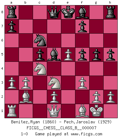 Last move : 1-0 2007 March 19 7:26:17 [Event "FICGS__CHESS__CLASS_B__000007"] [Site "FICGS"] [Date "2006.11.03"] [Round "1"] [White "Benitez,Ryan"] [Black "Pech,Jaroslav"] [Result "1-0"] [WhiteElo "1860"] [BlackElo "1929"] 1.e4 e6 2.Nf3 d5 3.e5 c5 4.Be2 Ne7 5.O-O Nbc6 6.c3 d4 7.Re1 d3 8.Bf1 b5 9.b3 Nf5 10.Bb2 h5 11.Na3 Ba6 12.c4 bxc4 13.Nxc4 Nb4 14.Re4 Bb7 15.Rf4 g5 16.Rxf5 exf5 17.Ne1 Be4 18.f3 Bd5 19.a3 Nc6 20.Nxd3 1-0 This chess game has been lost on time (started : 2006.11.03 10:59:11) French defense Kingside Castling by player White (move 5) Player White won this chess game. Follow this game move after move (download)I am the best player in the world and I am here to prove it. (Bobby Fischer) Im Fernschach kannst du während dem Spiel rauchen. (John Christen Knudsen) Es muy difícil jugar en contra de la teoría de Einstein. - en su primera derrota en contra de Fischer (Mikhail Tal) Avant la finale, les dieux ont créé le milieu de partie. (Tarrasch) Patience, use the Force, think ! (Obi-Wan Kenobi in Star Wars ep.2)