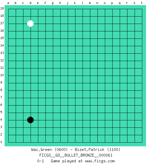 Last move : 0-1 2010 May 30 17:40:48 [Event "FICGS__GO__BULLET_BRONZE__000061"] [Site "FICGS"] [Date "2010.05.30"] [Round "1"] [Black "Wai,Green"] [White "Bizet,Patrick"] [Result "0-1"] [Rating 1 "0600"] [Rating 2 "1100"] 1.d4 d17 0-1 Here are the names of the openings (joseki) played in the four corners : Player White won this Go (weiqi, baduk) game. Follow this game move after move (download)Learn the eye-stealing tesuji. (Anonymous) Logic : The art of thinking and reasoning in strict accordance with the limitations and incapacities of the human misunderstanding. (Ambrose Bierce)