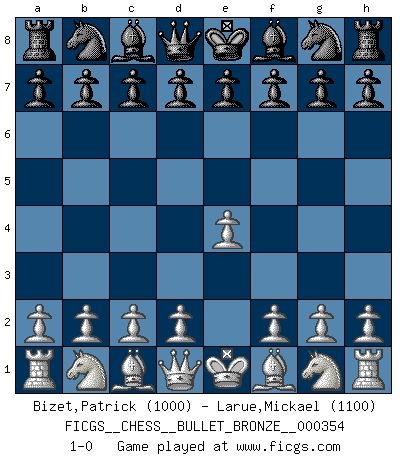 Last move : 1-0 2010 May 30 20:48:29 [Event "FICGS__CHESS__BULLET_BRONZE__000354"] [Site "FICGS"] [Date "2010.05.30"] [Round "1"] [White "Bizet,Patrick"] [Black "Larue,Mickael"] [Result "1-0"] [WhiteElo "1000"] [BlackElo "1100"] 1.e4 1-0 This chess game has been lost on time (started : 2010.05.30 18:3:35) King's pawn Opening Player White won this chess game. Follow this game move after move (download)Human affairs are like a Chess game: only those who do not take it seriously can be called good players. (Hung Tzu Ch'eng) Intelligenz läßt sich nicht am Weg, sondern nur am Ergebnis feststellen. (Garry Kasparov) ¡Examina movidas que hagan daño! Un buen ojo for movidas desvastantes es mucho mas importante que el conocimiento de principios estratégicos. (Purdy) Dieu déplace le joueur, et celui-ci la pièce. Quel Dieu derrière Dieu commence donc la trame ? Arturo Perez-Reverte (prix de littérature policière 1993). All battles are fought by scared men who'd rather be someplace else. (John Wayne in the movie In harm's way)