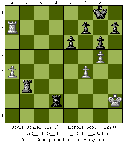 Last move : 0-1 2010 June 1 22:13:42 [Event "FICGS__CHESS__BULLET_BRONZE__000355"] [Site "FICGS"] [Date "2010.06.01"] [Round "1"] [White "Davis,Daniel"] [Black "Nichols,Scott"] [Result "0-1"] [WhiteElo "1773"] [BlackElo "2270"] 1.e4 d6 2.d4 Nf6 3.Nc3 g6 4.Nf3 Bg7 5.Bc4 O-O 6.O-O c6 7.Bg5 b5 8.Bd3 Nbd7 9.e5 dxe5 10.dxe5 Ng4 11.h3 Ngxe5 12.Qe2 Nxf3+ 13.Qxf3 Ne5 14.Qe3 b4 15.Na4 Nxd3 16.Qxd3 Qa5 17.Qb3 Qxg5 18.Qxb4 Bxh3 19.Qe4 Bf5 20.f4 Bxe4 21.fxg5 Bxc2 22.Rac1 Bxa4 23.b3 Bb5 24.Rf4 Rad8 25.a4 Bd3 26.Rxc6 Be4 27.Rxe4 e6 28.Ra6 Bd4+ 29.Kh2 Rd5 30.Rg4 Rb8 31.g3 Rxb3 32.Rf4 Be5 33.Rxa7 Bxf4 34.gxf4 Rd2+ 0-1 Pirc : Classical (Two knights) system Kingside Castling by player Black (move 5) Kingside Castling by player White (move 6) Player Black won this chess game. Follow this game move after move (download)It began to feel as though you were playing against Chess itself. - On playing against Robert Fischer. (Walter Shipman) Ein typischer, sehr verbreiteter Gedankenschädling ist der, daß der betreffende Amateur von der Annanhme ausgeht, daß jeder einzelne Zug etwas zu leisten habe. (Aaron Nimzowitsch) Cuando me preguntan: -¿Cual es el secreto que te hace hacer mejores movidas que tus oponentes?, Yo respondo: Me da gusto que me pregunten eso, porque, como veran, hay una simple razón. Yo pienso mis propias movidas y dejo a mi oponente que el piense las suyas. (Alexander Alekhine) La solitude du joueur d'Echecs à l'approche du mat est semblable à celle du condamné. (Francis Szpiner) Philosophers use a language that is already deformed as though by shoes that are too tight. (Ludwig Wittgenstein)
