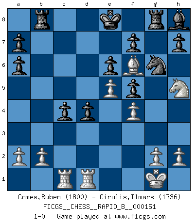 Last move : 1-0 2010 July 7 13:59:12 [Event "FICGS__CHESS__RAPID_B__000151"] [Site "FICGS"] [Date "2010.06.02"] [Round "1"] [White "Comes,Ruben"] [Black "Cirulis,Ilmars"] [Result "1-0"] [WhiteElo "1800"] [BlackElo "1736"] 1.e4 c6 2.c3 d5 3.e5 Bf5 4.d4 e6 5.Bd3 Ne7 6.Ne2 c5 7.O-O Nd7 8.Na3 Bxd3 9.Qxd3 Nf5 10.Nc2 Qc7 11.Ne3 g6 12.Nxf5 gxf5 13.Qh3 Qb6 14.Qh5 Bg7 15.Rd1 Nf8 16.Ng3 Ng6 17.Qe2 Qa6 18.Qxa6 bxa6 19.Nh5 Rg8 20.Bg5 Bh8 21.Bf6 Rb8 22.c4 dxc4 23.Rac1 cxd4 24.f4 1-0 Caro-Kann defense Kingside Castling by player White (move 7) Player White won this chess game. Follow this game move after move (download)Many have become Chess Masters, no one has become the Master of Chess. (Siegbert Tarrasch) Der vorletzte Fehler gewinnt. (Savielly Grigorievitsch Tartakower) El Ajedrez es el juego mas altamente simbólico, pero las agresiones estan por lo tanto aún mas francamente representadas en la partida. Tal vez comenzo como un juego de guerra; Algo como la representación de una batalla en miniatura entre las fuerzas de dos reinos. (Karl Meninger) Ce qui est bien, c'est d'avoir tout un tas de pièces en prise : l'adversaire ne peut en prendre qu'une à la fois. Cité par Thierry Audin. In God we trust, all others we virus scan. (Anonymous)