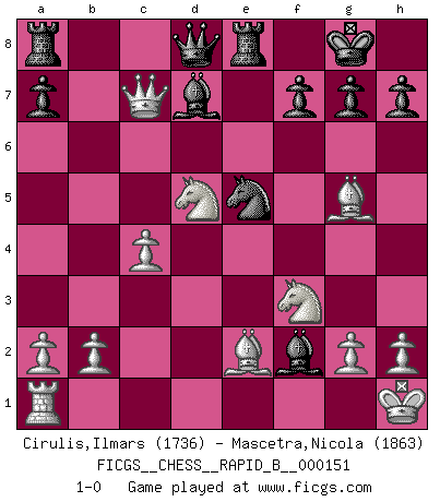 Last move : 1-0 2010 September 18 9:1:49 [Event "FICGS__CHESS__RAPID_B__000151"] [Site "FICGS"] [Date "2010.06.02"] [Round "1"] [White "Cirulis,Ilmars"] [Black "Mascetra,Nicola"] [Result "1-0"] [WhiteElo "1736"] [BlackElo "1863"] 1.f4 d5 2.Nf3 Nc6 3.e3 Nf6 4.c4 d4 5.Qa4 dxe3 6.dxe3 Bd7 7.Qb3 e5 8.fxe5 Ng4 9.Be2 Bc5 10.O-O O-O 11.Nc3 Bxe3+ 12.Kh1 Re8 13.Nd5 Bc5 14.Qxb7 Nf2+ 15.Rxf2 Bxf2 16.Qxc7 Nxe5 17.Bg5 1-0 Bird's Opening Kingside Castling by player White (move 10) Kingside Castling by player Black (move 10) Player White won this chess game. Follow this game move after move (download)When you absolutely don't know what to do anymore, it is time to panic. (John van der Wiel) Du musst Deinen Gegner in einen tiefen dunklen Wald führen wo 2+2=5 ist und wo der Weg, der wieder hinausführt, nur breit genug für einen ist. (Mikhail Nekhemyevich Tal) Sin errores no puede haber brillantez. (Emanuel Lasker) Des combinaisons [dans le jeu d'échecs] pareilles à des mélodies. Je crois entendre pour ainsi dire la musique des coups... (Vladimir Nabokov) Hold em is to stud what chess is to checkers. (Johnny Moss)
