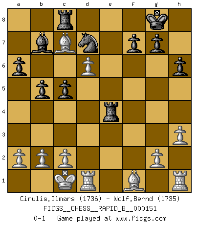 Last move : 0-1 2010 August 19 22:43:20 [Event "FICGS__CHESS__RAPID_B__000151"] [Site "FICGS"] [Date "2010.06.02"] [Round "1"] [White "Cirulis,Ilmars"] [Black "Wolf,Bernd"] [Result "0-1"] [WhiteElo "1736"] [BlackElo "1735"] 1.f4 e5 2.fxe5 d6 3.exd6 Bxd6 4.Nf3 Nf6 5.e3 Ng4 6.d4 Qe7 7.Qe2 O-O 8.Nc3 Re8 9.e4 c5 10.d5 h6 11.Bd2 Nd7 12.O-O-O a6 13.h3 Ngf6 14.Nh4 b5 15.Nf5 Qf8 16.Nxd6 Qxd6 17.Qf3 Bb7 18.Re1 Rad8 19.Qf5 Qe5 20.Qxe5 Rxe5 21.Bf4 R5e8 22.Bc7 Rc8 23.d6 Re5 24.Rd1 Nxe4 25.Nxe4 Rxe4 0-1 This chess game has been lost on time (started : 2010.06.02 13:24:54) Bird : From gambit Kingside Castling by player Black (move 7) Queenside Castling by player White (move 12) Player Black won this chess game. Follow this game move after move (download)War is the child of passion, passion is the child of narcissism and narcissism is the child. (...) Another game ? (Thibault de Vassal) Nie in meinem Leben habe ich die französische Verteidigung gespielt, welche die Stumpfsinnigste von allen ist. (Wilhelm Steinitz) El Ajedrez es un juego terrible. Si no dominas el centro, tu oponente tiene una posición mas libre. Si tu tienes el centro, entonces realmente tienes algo de que preocuparte. (Siegbert Tarrasch) Avec des compensations pour le matériel en plus... (Anonyme) Kids, you tried your best and you failed miserably. The lesson is, never try. (Simpsons)