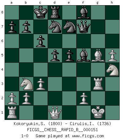Last move : 1-0 2010 June 23 22:34:51 [Event "FICGS__CHESS__RAPID_B__000151"] [Site "FICGS"] [Date "2010.06.02"] [Round "1"] [White "Kokoryukin,Sergey"] [Black "Cirulis,Ilmars"] [Result "1-0"] [WhiteElo "1800"] [BlackElo "1736"] 1.e4 c6 2.d4 d5 3.e5 Bf5 4.Nf3 e6 5.Be2 Nd7 6.c3 Ne7 7.O-O Ng6 8.Ne1 h5 9.h3 Qc7 10.Bxh5 f6 11.g4 Rxh5 12.gxh5 Ne7 13.exf6 gxf6 14.Ng2 O-O-O 15.Re1 Qd6 16.Nh4 e5 17.Re3 Qe6 18.Nd2 Bxh3 19.Rg3 Bf5 20.Nb3 Qf7 21.dxe5 fxe5 22.Bg5 1-0 Caro-Kann : Advance variation Kingside Castling by player White (move 7) Queenside Castling by player Black (move 14) Player White won this chess game. Follow this game move after move (download)Chess is the art which expresses the science of logic. (Mikhail Botvinnik) Ich glaube nicht an Psychologie, ich glaube an gute Züge. (Robert James Fischer) Por la belleza de sus partidas, la claridad de su juego y lo brillante de sus ideas, Fischer se creó el mismo como un artista de la misma estatura como Brahms, Rembrandt y Shakespeare. (David Levy) J'ai vu le vaincu d'Echecs jouer des années durant dans l'espoir de la fête de la victoire. Car tu es plus riche de ce qu'elle existe si même elle n'est point pour toi. Ainsi de la perle du fond des mers. (Antoine de Saint-Exupéry) An expert is a man who has made all the mistakes which can be made in a very narrow field. (Niels Bohr)