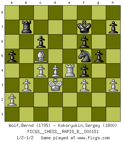 Last move : 1/2-1/2 2010 June 9 14:6:2 [Event "FICGS__CHESS__RAPID_B__000151"] [Site "FICGS"] [Date "2010.06.02"] [Round "1"] [White "Wolf,Bernd"] [Black "Kokoryukin,Sergey"] [Result "1/2-1/2"] [WhiteElo "1735"] [BlackElo "1800"] 1.e4 e5 2.f4 exf4 3.Nf3 d5 4.exd5 Nf6 5.Bb5+ c6 6.dxc6 Nxc6 7.d4 Bd6 8.O-O O-O 9.c4 Bg4 10.Nc3 Rc8 11.Bxc6 bxc6 12.h3 Be6 13.b3 Nh5 14.Ne4 Be7 15.Re1 Bf5 16.Qd2 Re8 17.Bb2 Bb4 18.Bc3 Bxe4 19.Bxb4 Bxf3 20.Rxe8+ Qxe8 21.gxf3 f6 22.Re1 Qg6+ 23.Kh1 Qg5 24.Qf2 Ng3+ 25.Kh2 Nf5 26.Re4 Kf7 27.Qg2 Qxg2+ 28.Kxg2 g5 29.Kf2 Rc7 30.Bc5 Ne3 31.Ke2 Rb7 32.Kd3 a5 33.Bd6 Nf5 34.Bc5 Nh4 35.Ke2 Nf5 36.Kd3 1/2-1/2 KGA : Abbazia defense, Modern variation Kingside Castling by player White (move 8) Kingside Castling by player Black (move 8) This chess game ended in a draw. Follow this game move after move (download)Chess is no whit inferior to the violin, and we have a large number of professional violinists. (Mikhail Botvinnik) Gewöhnliche Menschen denken nur daran, wie sie ihre Zeit verbringen. Ein intelligenter Mensch versucht, sie auszunutzen. (Arthur Schopenhauer) No es suficiente ser un buen jugador, se debe también de jugar bién. (Siegbert Tarrasch) Celui qui prend des risques peut perdre, celui qui n'en prend pas perd toujours. (Xavier Tartacover) There are two kinds of tragedy in this world, one is not getting what you want and the other is getting. (Lord of war)