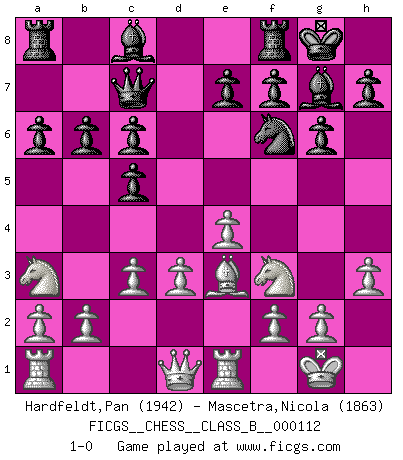 Last move : 1-0 2010 September 2 23:1:25 [Event "FICGS__CHESS__CLASS_B__000112"] [Site "FICGS"] [Date "2010.06.02"] [Round "1"] [White "Hardfeldt,Pan"] [Black "Mascetra,Nicola"] [Result "1-0"] [WhiteElo "1942"] [BlackElo "1863"] 1.e4 c5 2.Na3 Nc6 3.Bb5 Nf6 4.d3 g6 5.Nf3 Bg7 6.O-O O-O 7.Re1 a6 8.Bxc6 dxc6 9.c3 Qc7 10.Be3 b6 11.h3 1-0 Sicilian defense Kingside Castling by player White (move 6) Kingside Castling by player Black (move 6) Player White won this chess game. Follow this game move after move (download)Some part of a mistake is always correct. (Savielly Tartakover) Schon mancher Spieler hat aufgegeben, um zu vermeiden, daß er eine Figur verliert. (Savielly Grigorievitsch Tartakower) El jugador táctico sabe que hacer cuando hay algo que hacer; mientras que el estratega sabe que hacer cuando no hay nada que hacer. (Gerald Abrahams) 'L'échange des dames est un coup dur pour les deux adversaires...' Un journaliste lors d'une partie du match Spassky-Fischer May I never be complete. May I never be content. May I never be perfect. Deliver me, Tyler, from being perfect and complete. (Chuck Palahniuk, Fight Club)