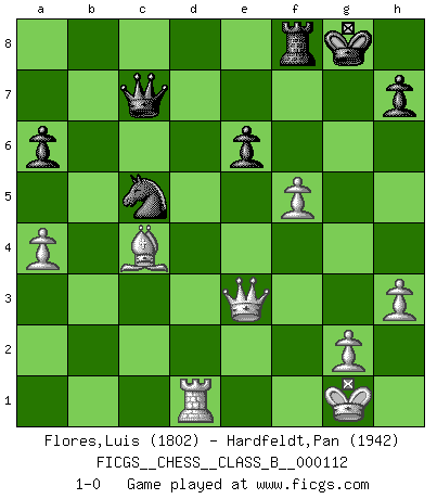 Last move : 1-0 2010 November 17 11:28:22 [Event "FICGS__CHESS__CLASS_B__000112"] [Site "FICGS"] [Date "2010.06.02"] [Round "1"] [White "Flores,Luis"] [Black "Hardfeldt,Pan"] [Result "1-0"] [WhiteElo "1802"] [BlackElo "1942"] 1.e4 c5 2.Nf3 d6 3.d4 cxd4 4.Nxd4 g6 5.Nc3 Bg7 6.Be3 Nf6 7.Be2 Nc6 8.O-O O-O 9.h3 Bd7 10.Nf3 Qc7 11.Qd2 Qa5 12.a3 Rfc8 13.Rad1 Be6 14.Ng5 Ne8 15.Nxe6 Bxc3 16.bxc3 fxe6 17.Bc4 Nd8 18.Bb3 Qxc3 19.Qe2 Ng7 20.Bd4 Qa5 21.Qe3 Nc6 22.Bb2 Rf8 23.Qh6 Rf7 24.Bxg7 Rxg7 25.Bxe6+ Kh8 26.Qe3 Qe5 27.Bd7 Rf7 28.Rb1 e6 29.Rxb7 Nd8 30.Rc7 Qg7 31.Rc8 Rxc8 32.Bxc8 Rc7 33.Ba6 Rxc2 34.Rd1 Rc6 35.Bb5 Rb6 36.a4 Kg8 37.Qg5 Rb8 38.Qf4 Nb7 39.Qe3 Nc5 40.Rxd6 Qe5 41.Rd1 a6 42.f4 Qc7 43.Bc4 Rf8 44.f5 gxf5 45.exf5 1-0 Sicilian Kingside Castling by player White (move 8) Kingside Castling by player Black (move 8) Player White won this chess game. Follow this game move after move (download)I had a toothache during the first game. In the second game I had a headache. In the third game it was an attack of rheumatism. In the fourth game, I wasn't feeling well. And in the fifth game? Well, must one have to win every game ? (Siegbert Tarrasch) Ich könnte leicht behaupten: Ja,ja, Leonid Breschnew wollte nicht, daß ich Weltmeister werde. In der Tat war die Sache komplizierter. (Viktor Kortschnoi) Bobby solo arroja las piezas y solas caen en las casillas correctas. (Miguel Najdorf ) Des combinaisons [dans le jeu d'échecs] pareilles à des mélodies. Je crois entendre pour ainsi dire la musique des coups... (Vladimir Nabokov) Luck never gives; it only lends. (Swedish proverb)