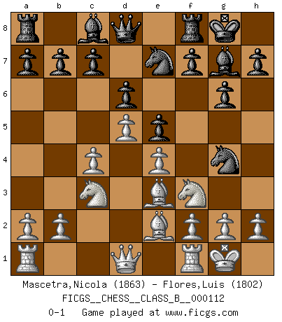Last move : 0-1 2010 September 11 11:28:49 [Event "FICGS__CHESS__CLASS_B__000112"] [Site "FICGS"] [Date "2010.06.02"] [Round "1"] [White "Mascetra,Nicola"] [Black "Flores,Luis"] [Result "0-1"] [WhiteElo "1863"] [BlackElo "1802"] 1.d4 Nf6 2.c4 g6 3.Nc3 Bg7 4.e4 d6 5.Be2 Nc6 6.Nf3 O-O 7.O-O e5 8.d5 Ne7 9.Be3 Ng4 0-1 King's Indian : 5.Be2 Kingside Castling by player Black (move 6) Kingside Castling by player White (move 7) Player Black won this chess game. Follow this game move after move (download)A strong memory, concentration, imagination, and a strong will is required to become a great Chess player. (Bobby Fischer) Vielleicht wirkt die Aura früherer Spieler glanzvoller als die der heutigen Spieler, aber das liegt daran, dass man kein Programm wie Fritz hatte, das einem all die Löcher in ihren Partien zeigt. (Vladimir Kramnik) El Ajedrez es despiadado: debes de estar preparado para matar gente. (Nigel Short) Mais n'est-ce pas déjà le limiter injurieusement que d'appeler les échecs un jeu? N'est-ce pas aussi une science, un art, ou quelque chose qui, comme le cercueil de Mahomet entre ciel et terre, est suspendu entre l'un et l'autre, et qui réunit un nombre incroyable de contraires ? (Stefan Zweig) Hello Thibault, if I have had a plan (and I had one, I hope), I have forgotten it during the last week... - Hello Heinz-Georg. What do you mean a plan ? (Anonymous players, during a Big Chess game)