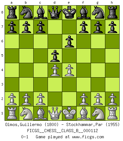 Last move : 0-1 2010 July 19 21:37:24 [Event "FICGS__CHESS__CLASS_B__000112"] [Site "FICGS"] [Date "2010.06.02"] [Round "1"] [White "Olmos,Guillermo"] [Black "Stockhammar,Par"] [Result "0-1"] [WhiteElo "1800"] [BlackElo "1955"] 1.e4 e6 2.d4 d5 0-1 This chess game has been lost on time (started : 2010.06.02 13:26:11) French defense Player Black won this chess game. Follow this game move after move (download)Some sacrifices are sound; the rest are mine. (Mikhail Tal) Strategie ist, wie man ein Mädchen auf den Rücksitz bekommt. Taktik ist, was man tut, wenn man dann dort ist. (Anonymous) Una buena memoria, concentración, imaginación y una fuerte voluntad, se requiere para llegar a ser un buen jugador. (Bobby Fischer) Il a essayé de se convaincre qu'il pourrait empêcher toutes les erreurs et ne jamais perdre. L'horreur ! Gary Kasparov au sujet de Robert Fischer. The man who strikes first admits that his ideas have given out. (Chinese proverb)