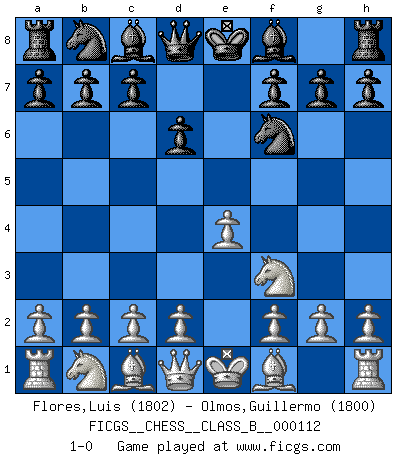 Last move : 1-0 2010 July 21 21:40:6 [Event "FICGS__CHESS__CLASS_B__000112"] [Site "FICGS"] [Date "2010.06.02"] [Round "1"] [White "Flores,Luis"] [Black "Olmos,Guillermo"] [Result "1-0"] [WhiteElo "1802"] [BlackElo "1800"] 1.e4 e5 2.Nf3 Nf6 3.Nxe5 d6 4.Nf3 1-0 This chess game has been lost on time (started : 2010.06.02 13:26:11) Petrov's defense Player White won this chess game. Follow this game move after move (download)Chess is the art of analysis. (Mikhail Botvinnik) Wir irren allesamt, nur jeder irrt anders. (Georg Christoph Lichtenberg) Prefiero perder una partida realmente buena, que ganar una mala. (David Levy) La guerre est enfant de la passion, la passion est enfant du narcissisme et le narcissisme est l'enfant. (...) Une autre partie ? (Thibault de Vassal) There's no money in correspondence chess. (John Knudsen)
