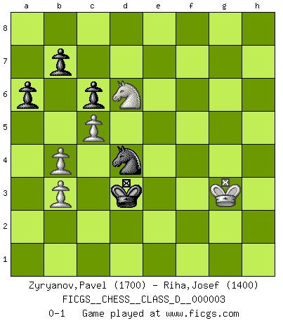 Last move : 0-1 2006 July 15 9:40:33 [Event "FICGS__CHESS__CLASS_D__000003"] [Site "FICGS"] [Date "2006.04.26"] [Round "1"] [White "Zyryanov,Pavel"] [Black "Riha,Josef"] [Result "0-1"] [WhiteElo "1700"] [BlackElo "1400"] 1.e4 e5 2.Bc4 Nf6 3.d3 Nc6 4.Nf3 Bc5 5.O-O d6 6.Be3 Bxe3 7.fxe3 Na5 8.Bb3 Nxb3 9.axb3 O-O 10.Qe1 d5 11.exd5 Nxd5 12.Nc3 f6 13.Ra4 Be6 14.Rh4 c6 15.Ne4 Qb6 16.d4 Bf5 17.Nfd2 Bxe4 18.Rxe4 Rae8 19.Rf2 Qc7 20.Nf3 exd4 21.exd4 Rxe4 22.Qxe4 Qd7 23.Re2 Nc7 24.Qd3 Re8 25.c4 Rxe2 26.Qxe2 Kf7 27.Qe4 Qe7 28.Qxe7+ Kxe7 29.Kf2 Kd6 30.Ke3 g6 31.g4 Ne8 32.b4 Ke6 33.b3 Ng7 34.g5 Kf5 35.gxf6 Kxf6 36.Nd2 Nf5+ 37.Kd3 Ke6 38.Ne4 Ke7 39.Nc3 a6 40.Ne4 Nd6 41.Nc5 h5 42.Ke3 Kf6 43.Nd7+ Kf5 44.Ne5 g5 45.h3 g4 46.hxg4+ hxg4 47.c5 Nb5 48.Nf7 g3 49.Kf3 Nxd4+ 50.Kxg3 Ke4 51.Nd6+ Kd3 0-1 Bishop's Opening : Berlin defense Kingside Castling by player White (move 5) Kingside Castling by player Black (move 9) 10 pieces endgame at move 50 : White KNPPP , Black KNPPP WHITE : King + 1 Knight 3 Pawns BLACK : King + 1 Knight 3 Pawns Player Black won this chess game. Follow this game move after move (download)I play correspondence chess because it is both art and science while chess is art only. (A player at FICGS) Rauchen ist dem Schachspieler bei seiner Arbeit, also im Wettkampf, untersagt. (Viktor Kortschnoi) El Ajedrez es imaginación. (David Bronstein) Un millionnaire : 'Monsieur Steinitz ! Vous ne participez aux tournois que pour l'argent, alors que moi je n'y viens que pour l'honneur.' Steinitz : 'Chacun joue pour ce qu'il n'a pas'... Convictions are more dangerous enemies of truth than lies. (Friedrich Nietzsche)