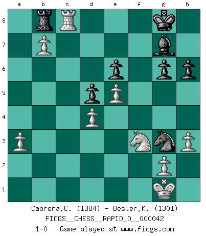 Last move : 1-0 2010 July 6 8:28:42 [Event "FICGS__CHESS__RAPID_D__000042"] [Site "FICGS"] [Date "2010.06.02"] [Round "1"] [White "Cabrera,Claudio"] [Black "Bester,Kazimierz"] [Result "1-0"] [WhiteElo "1384"] [BlackElo "1301"] 1.e4 c5 2.Nf3 Nc6 3.c3 d6 4.d4 cxd4 5.cxd4 Nf6 6.Nc3 a6 7.Be2 g6 8.O-O Bg7 9.h3 O-O 10.Be3 e6 11.Qd2 b5 12.a3 Na5 13.Rad1 d5 14.e5 Nd7 15.Nxb5 axb5 16.Bxb5 Nc4 17.Qc3 Nxe3 18.fxe3 Nb6 19.Rc1 Bb7 20.Qc7 Ra7 21.Rc3 Qxc7 22.Rxc7 Rfa8 23.Ng5 Ba6 24.Rxa7 Rxa7 25.Bxa6 Rxa6 26.Nxf7 Nc4 27.Ng5 Nxe3 28.Rc1 Ra8 29.Rc7 Re8 30.b4 Nf5 31.b5 h6 32.Nf3 Ng3 33.b6 Ra8 34.b7 Rb8 35.Rc8+ 1-0 Sicilian defense Kingside Castling by player White (move 8) Kingside Castling by player Black (move 9) Player White won this chess game. Follow this game move after move (download)In Chess, as it is played by masters, chance is practically eliminated. (Emanuel Lasker) Ich bin der einzige Schachspieler, der sich während der Vorbereitungen zum Turnier verletzt hat. (Woody Allen) El Ajedrez es 99 por ciento táctica. (Teichmann) Vous savez, camarade Pachman, je n'éprouve pas de plaisir à être ministre, je jouerais plutôt aux échecs comme vous, ou alors ferais une révolution au Venezuela. (Che Guevara à Ludek Pachman, 'Checkmate in Prague', 1975) We're missing something. (Gregory House, House M.D.)