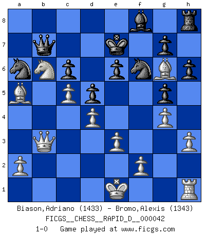 Last move : 1-0 2010 July 17 17:4:42 [Event "FICGS__CHESS__RAPID_D__000042"] [Site "FICGS"] [Date "2010.06.02"] [Round "1"] [White "Biason,Adriano"] [Black "Bromo,Alexis"] [Result "1-0"] [WhiteElo "1433"] [BlackElo "1343"] 1.d4 d5 2.c4 c6 3.Nf3 Nf6 4.Nc3 h6 5.e3 Bg4 6.h3 Bh5 7.g4 Bg6 8.Ne5 e6 9.Nxg6 fxg6 10.Bd3 g5 11.c5 Na6 12.Bg6+ Kd7 13.b4 Nxb4 14.Rb1 Na6 15.Rxb7+ Nc7 16.Ba3 Rb8 17.Rxa7 Ra8 18.Ra4 Rxa4 19.Nxa4 Qb8 20.Nb6+ Kd8 21.Qa4 Qb7 22.Bb4 Na6 23.Ba5 Ke7 24.Qb3 1-0 QGD Slav : 4.Nc3 Player White won this chess game. Follow this game move after move (download)Good offense and good defense both begin with good development. (Bruce A. Moon) Herr Iljumschinow ist ein etwas merkwürdiger Geschäftsmann: Er arbeitet zusammen mit Leuten wie Muammar al-Gaddafi; früher ist das Saddam Hussein gewesen. (Joel Lautier) Uno no tiene que jugar muy bien, es suficiente jugar mejor que el oponente. (Siegbert Tarrasch) Aidez vos pièces, elles vous aideront. (Paul Morphy) However beautiful the strategy, you should occasionally look at the results. (Winston Churchill)