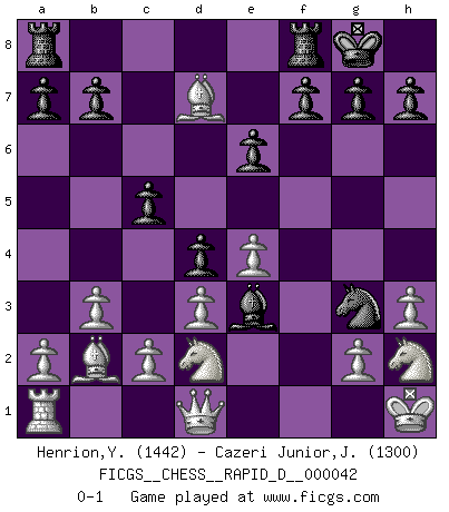 Last move : 0-1 2010 June 23 23:23:57 [Event "FICGS__CHESS__RAPID_D__000042"] [Site "FICGS"] [Date "2010.06.02"] [Round "1"] [White "Henrion,Yann"] [Black "Cazeri Junior,Jose Roque"] [Result "0-1"] [WhiteElo "1442"] [BlackElo "1300"] 1.f4 d5 2.Nf3 Nf6 3.e3 c5 4.b3 Nc6 5.Bb2 e6 6.Bb5 Bd7 7.h3 Bd6 8.O-O O-O 9.d3 d4 10.e4 Bxf4 11.Nbd2 Be3+ 12.Kh1 Nh5 13.Bxc6 Ng3+ 14.Kh2 Qc7 15.Bxd7 Nxf1+ 16.Kh1 Qh2+ 17.Nxh2 Ng3+ 0-1 Bird's Opening : Lasker variation Kingside Castling by player White (move 8) Kingside Castling by player Black (move 8) Player Black won this chess game. Follow this game move after move (download)Fischer wanted to give the Russians a taste of their own medicine. (Larry Evans) Offener Brief an US-Präsident Bush anlässlich der Verhaftung Bobby Fishers: Verhaften Sie mich. Stecken Sie mich in dieselbe Zelle wie Bobby Fisher und geben Sie uns ein Schachspiel mit. (Boris Vassilievich Spassky) Aún deseo matar a Fischer. (Boris Spassky) Pour se monter efficace, un Cavalier a besoin d'avant-postes ! Les Cavaliers font les meilleurs bloqueurs de pions passés. The real voyage of discovery consists not in seeking new lands but in seeing with new eyes. (Marcel Proust)