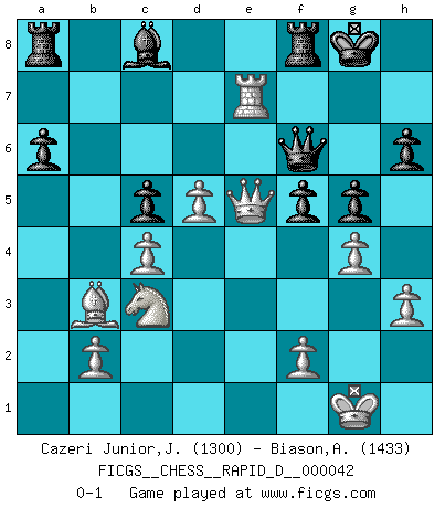 Last move : 0-1 2010 September 5 11:14:37 [Event "FICGS__CHESS__RAPID_D__000042"] [Site "FICGS"] [Date "2010.06.02"] [Round "1"] [White "Cazeri Junior,Jose Roque"] [Black "Biason,Adriano"] [Result "0-1"] [WhiteElo "1300"] [BlackElo "1433"] 1.e4 g6 2.d4 Bg7 3.Nf3 d6 4.Bc4 e6 5.O-O a6 6.Bb3 b6 7.c4 Bb7 8.Nc3 Ne7 9.Qd3 Nd7 10.Bg5 h6 11.Be3 O-O 12.h3 Kh7 13.a4 c5 14.d5 exd5 15.exd5 Nf5 16.Rfe1 Nxe3 17.Rxe3 Ne5 18.Nxe5 Bxe5 19.Rae1 Bc8 20.Rxe5 dxe5 21.Rxe5 Qd6 22.Re2 Bf5 23.Qf3 Qd8 24.g4 Bc8 25.a5 f5 26.axb6 Qxb6 27.Re7+ Kg8 28.Qf4 g5 29.Qe5 Qf6 0-1 This chess game has been lost on time (started : 2010.06.02 13:28:5) Robatsch (Modern) defense Kingside Castling by player White (move 5) Kingside Castling by player Black (move 11) Player Black won this chess game. Follow this game move after move (download)Up to this point White has been following well-known analysis. But now he makes a fatal error: he begins to use his own head. (Siegbert Tarrasch) Wenn Du nicht kämpfst, um anderen etwas zu beweisen, sondern nur für Dich selbst, dann bist du fast unbesiegbar. (Garry Kasparov) Para mi, el Ajedrez es la vida y cada partida es como una nueva vida. Todo jugador de Ajedrez suele vivir muchas vidas durante su vida. (Eduard Gufeld) Lorsque vous vous retrouvez devant une position atroce, ne tendez pas un ultime piège dérisoire avec l'intention d'abandonner si l'adversaire le déjoue ! Faites-vous plutôt un devoir de résister comme si votre vie en dépendait. Jouez le coup qui vous déplairait au centuple si vous étiez dans la peau de votre tortionnaire ! Fear is the path to the dark side. Fear leads to anger; anger leads to hate; hate leads to suffering. I sense much fear in you. (Master Yoda in Star Wars ep.1)