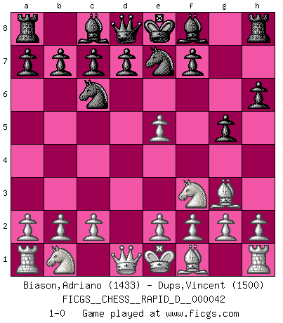 Last move : 1-0 2010 July 9 9:20:39 [Event "FICGS__CHESS__RAPID_D__000042"] [Site "FICGS"] [Date "2010.06.02"] [Round "1"] [White "Biason,Adriano"] [Black "Dups,Vincent"] [Result "1-0"] [WhiteElo "1433"] [BlackElo "1500"] 1.d4 e5 2.dxe5 Nc6 3.Nf3 Nge7 4.Bg5 h6 5.Bh4 g5 6.Bg3 1-0 This chess game has been lost on time (started : 2010.06.02 13:28:5) Queen's pawn : Charlick (Englund) gambit Player White won this chess game. Follow this game move after move (download)Chess is not like life... it has rules ! (Mark Pasternak) Ohne ihre Erfolge schmälern zu wollen würde ich sagen Petrosian, Spassky und Karpov verdanken ihre Siege ihren Trainern - Boleslavsky, Bondarevsky und Furman. (Mikhail Moiseyevich Botvinik) El Ajedrez es sobre todo, ¡una pelea!. (Emanuel Lasker) Psychologiquement, tu dois avoir confiance en toi même, mais cette confiance doit être basée sur des faits. (Robert Fischer) Do you know these so called Volunteers don't even get paid! (Simpsons)