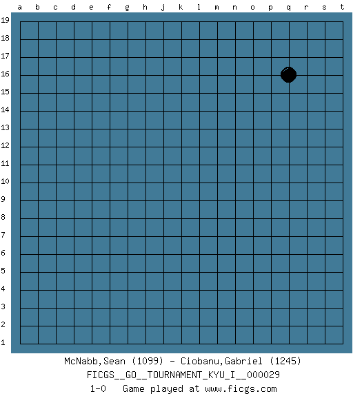 Last move : 1-0 2010 July 2 21:12:30 [Event "FICGS__GO__TOURNAMENT_KYU_I__000029"] [Site "FICGS"] [Date "2010.06.02"] [Round "1"] [Black "McNabb,Sean"] [White "Ciobanu,Gabriel"] [Result "1-0"] [Rating 1 "1099"] [Rating 2 "1245"] 1.q16 1-0 This go game has been lost on time (started : 2010.06.02 14:53:59) Here are the names of the openings (joseki) played in the four corners : Player Black won this Go (weiqi, baduk) game. Follow this game move after move (download)Go is not a blocking game, it's a game of action. (Pierre Audouard) History is the quarrels of popes and kings, with wars or pestilences in every page; the men all so good for nothing, and hardly any women at all. (Jane Austen)