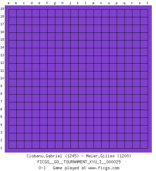 Last move : 0-1 2010 July 2 21:12:30 [Event "FICGS__GO__TOURNAMENT_KYU_I__000029"] [Site "FICGS"] [Date "2010.06.02"] [Round "1"] [Black "Ciobanu,Gabriel"] [White "Meier,Gilles"] [Result "0-1"] [Rating 1 "1245"] [Rating 2 "1200"] 0-1 This go game has been lost on time (started : 2010.06.02 14:53:59) Here are the names of the openings (joseki) played in the four corners : Player White won this Go (weiqi, baduk) game. Follow this game move after move (download)The L-group is dead. (Anonymous) There are two kinds of tragedy in this world, one is not getting what you want and the other is getting. (Lord of war)