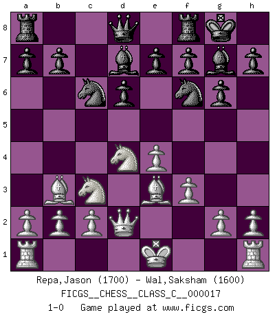 Last move : 1-0 2006 December 19 19:7:59 [Event "FICGS__CHESS__CLASS_C__000017"] [Site "FICGS"] [Date "2006.11.03"] [Round "1"] [White "Repa,Jason"] [Black "Wal,Saksham"] [Result "1-0"] [WhiteElo "1700"] [BlackElo "1600"] 1.e4 c5 2.Nf3 Nc6 3.d4 cxd4 4.Nxd4 Nf6 5.Nc3 g6 6.Be3 Bg7 7.Bc4 O-O 8.Bb3 d6 9.f3 Bd7 10.Qd2 1-0 This chess game has been lost on time (started : 2006.11.03 11:12:38) Sicilian defense Kingside Castling by player Black (move 7) Player White won this chess game. Follow this game move after move (download)Chess is so inspiring that I do not believe a good player is capable of having an evil thought during the game. (Wilhelm Steinitz) Der zweitbeste Zug ist oft der einzig richtige. (Savielly Grigorievitsch Tartakower) ¡Examina movidas que hagan daño! Un buen ojo for movidas desvastantes es mucho mas importante que el conocimiento de principios estratégicos. (Purdy) Si rien de grave n'est détecté lors de l'analyse d'une position, on joue alors le coup. Seconde règle de Blumenfeld. Convictions are more dangerous enemies of truth than lies. (Friedrich Nietzsche)